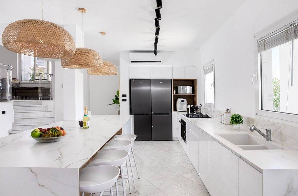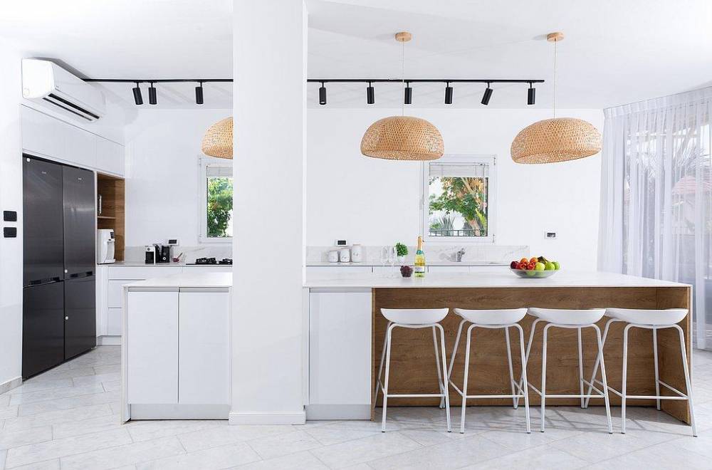 מטבח מאובזר הכולל מקרר כפול, כיור, תנור אפייה, מיקרוגל, פינת קפה, כלי אוכל והגשה