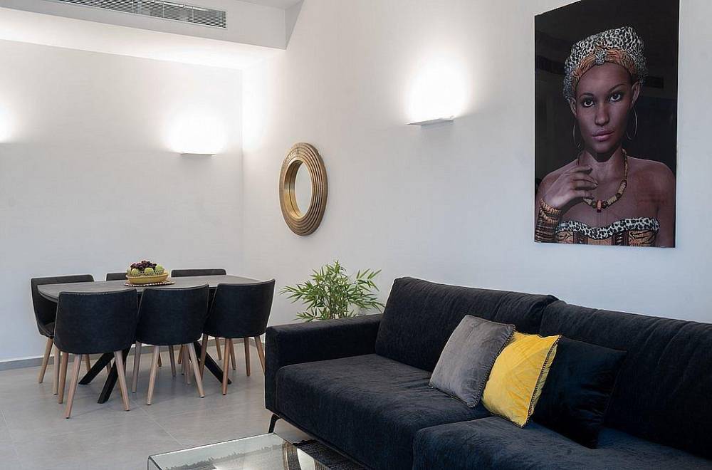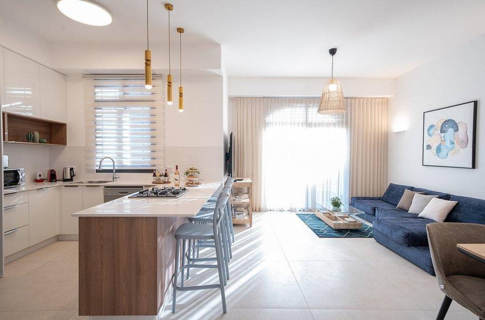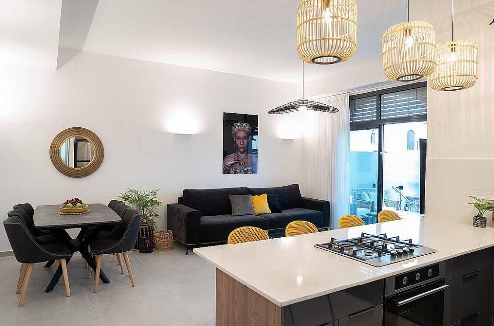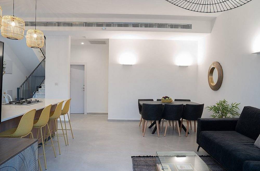 חלל הסלון תוכנן במחשבה על נוחיות האורחים עם ספות ארוכות לרביצה מושלמת