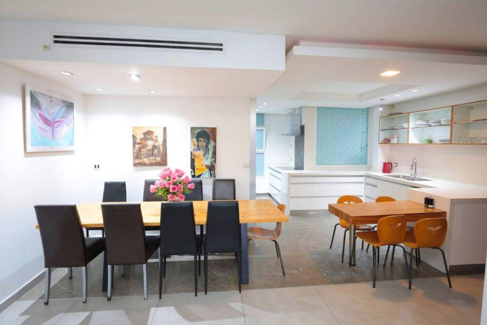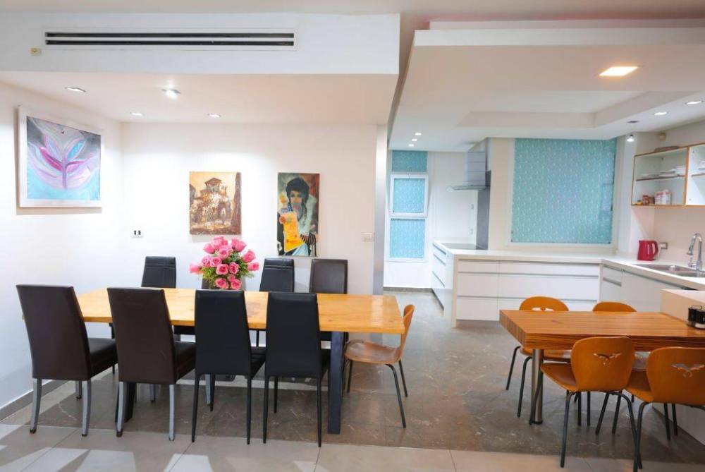 מטבח מאובזר קומפלט: קומקום חשמלי, תנור אפייה, מכונת אספרסו, מקרר, מכונת קרח, מדיח כלים, כיריים חשמליות,