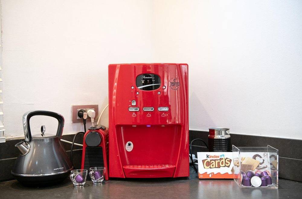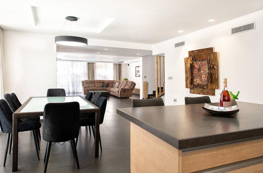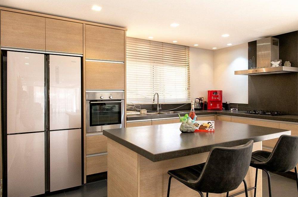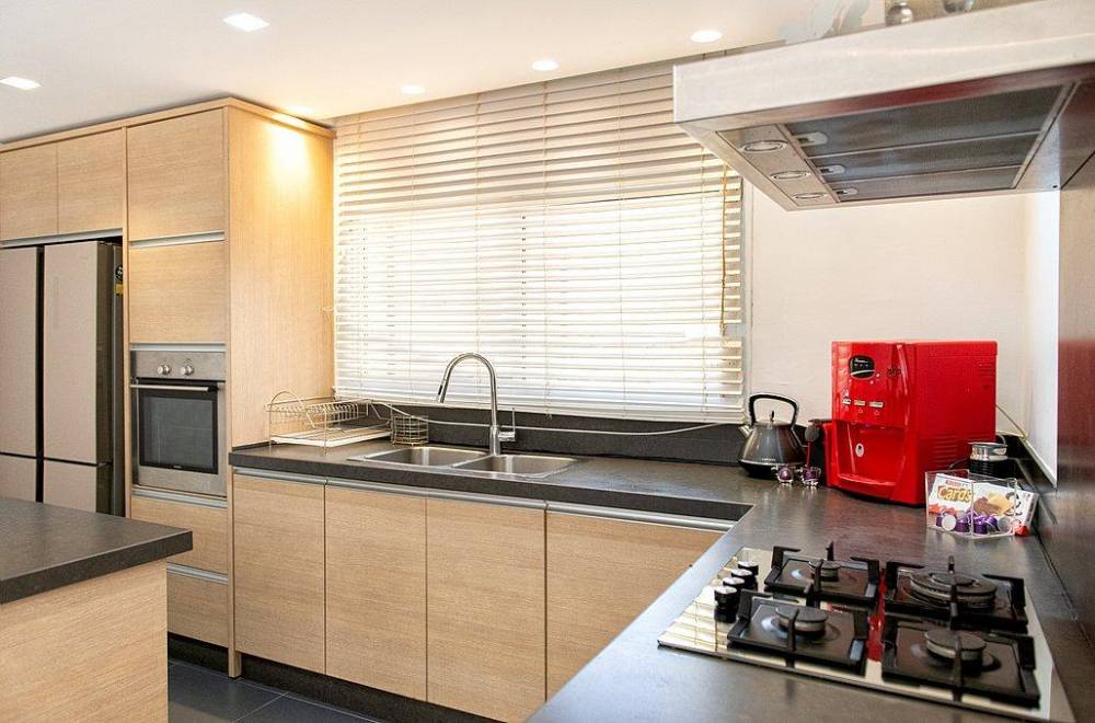 מטבח מאובזר קומפלט הכולל: מקרר עם בא מים מובנה וקרח, מיקרוגל, כיריים, תנור אפייה, טוסטר, מכונת אספרסו, קומקום חשמלי, כלי אוכל והגשה, לצידי המטבח ישנו אי + כיסאות גבוהים