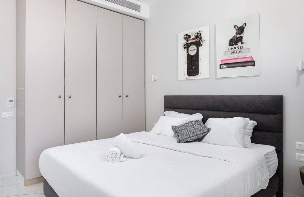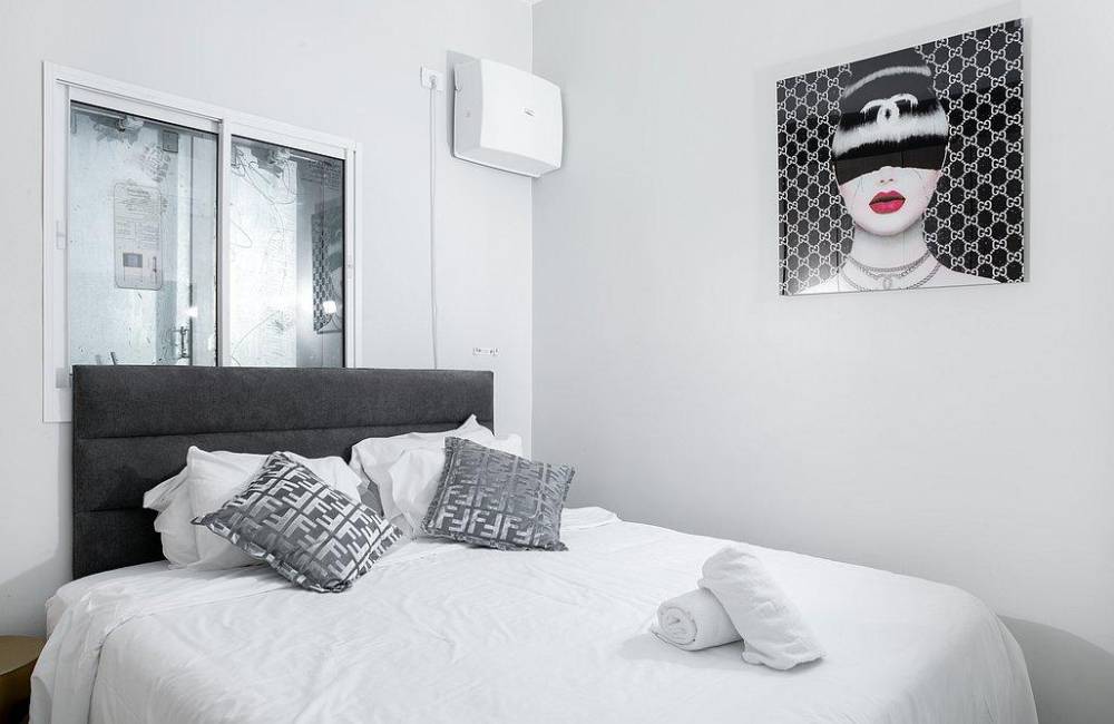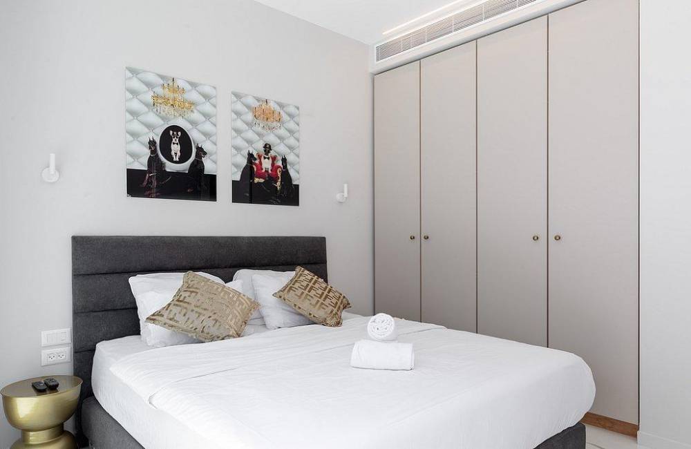 מיטה זוגית עם מזרן אורטופדי, שידות, מיזוג אוויר, מסך צפייה