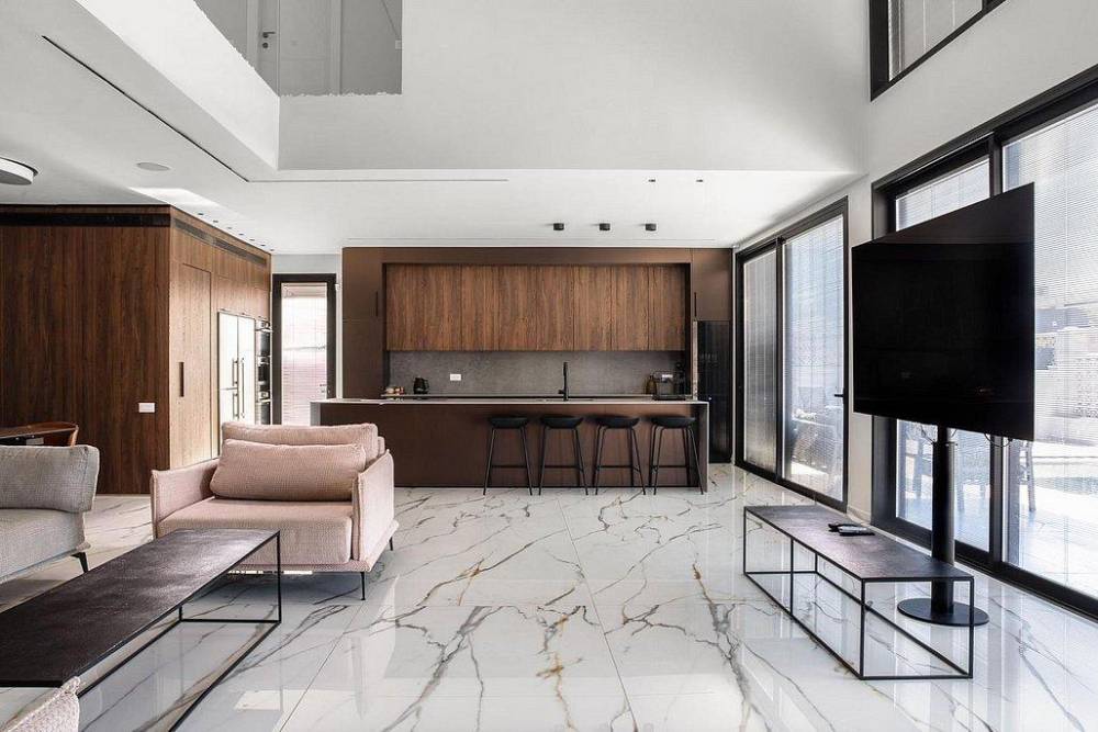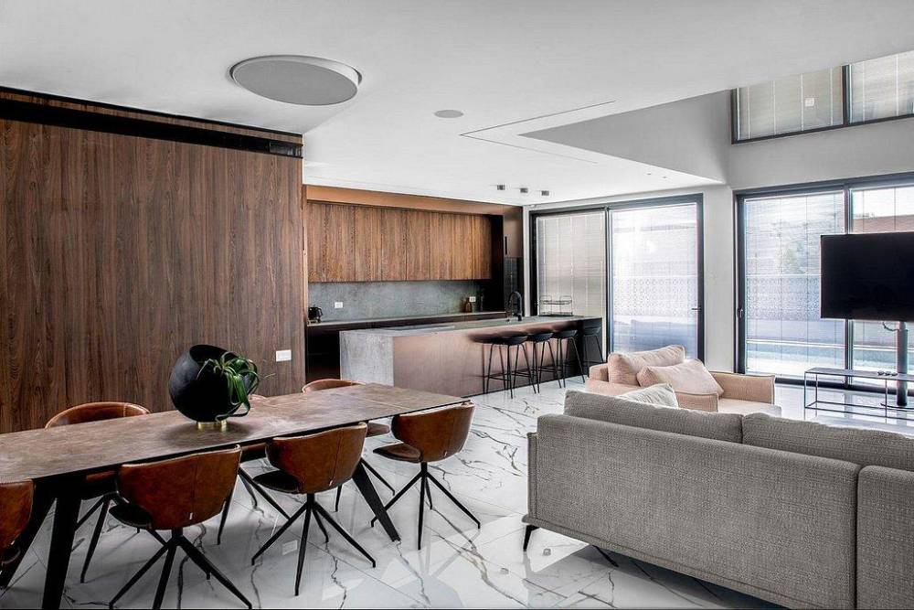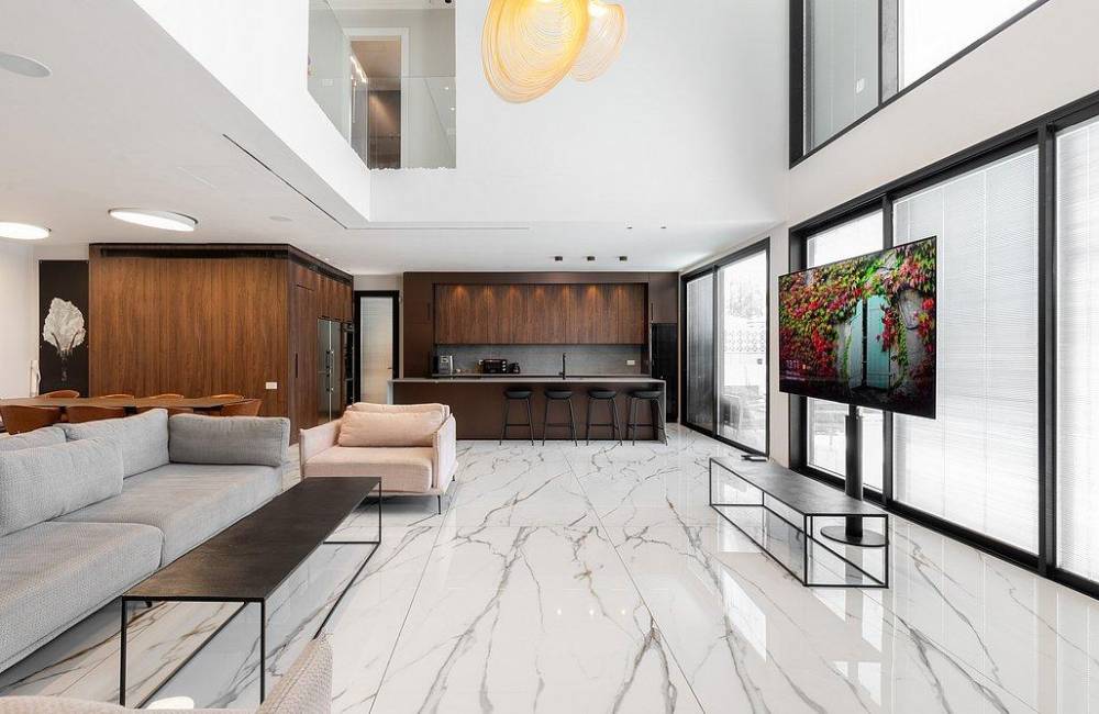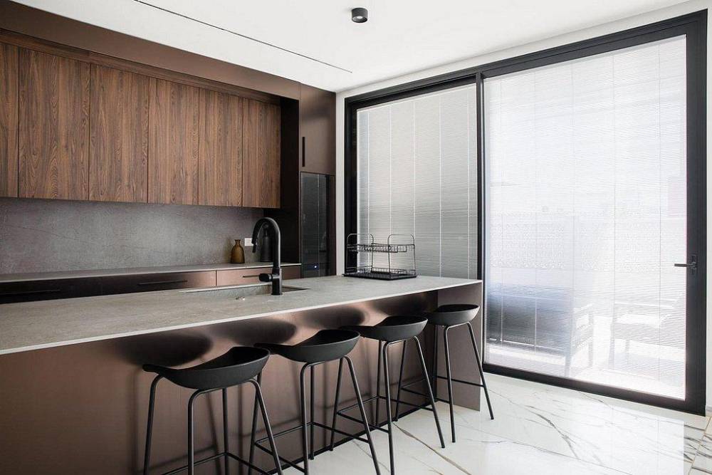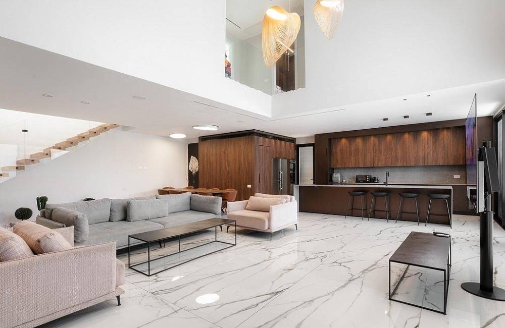 מטבח מאובזר יוקרתי הכולל: מקרר עם מתקן מים מובנה, מיקרוגל, מכונת קפה, מקרר יינות אינטגרלי, כיריים אינדוקציה,כלי אוכל והגשה