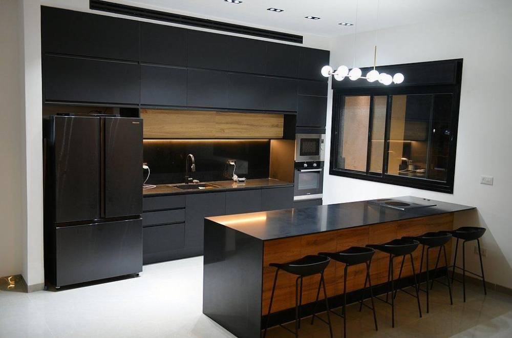 מטבח מאובזר הכולל: מקרר עם בר מים מובנה וקרח גרוס, מיקרוגל, תנור אפייה, כיריים אינדוקציה, כלי אוכל והגשה, פלטה ומיחם לשבת