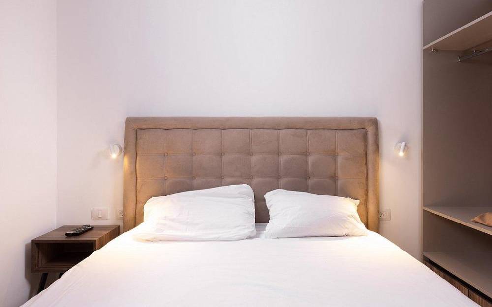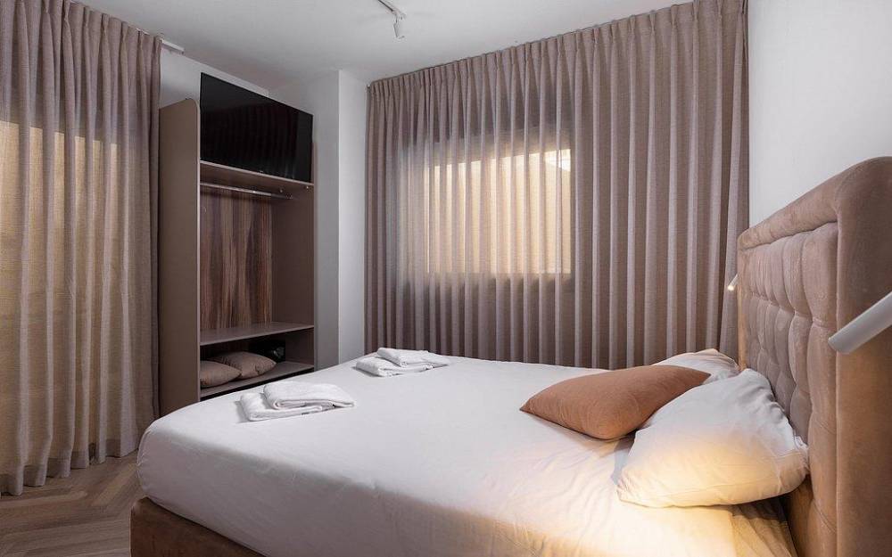 מיטה זוגית, מיזוג אוויר, טלוויזיה, שידות/ארון לאחסון ותאורת לילה.