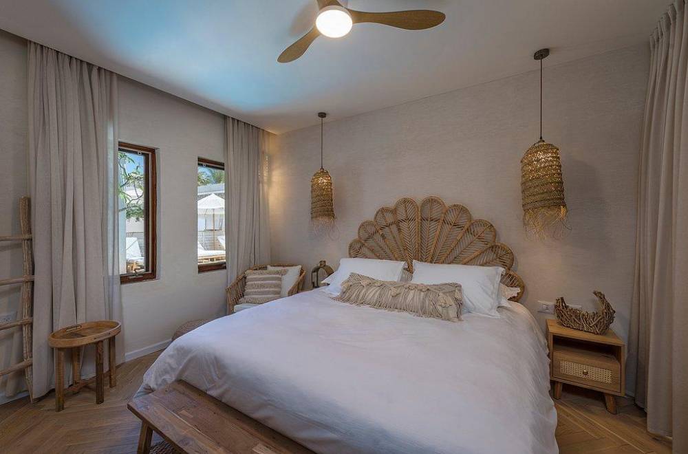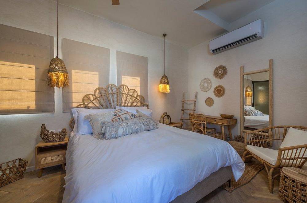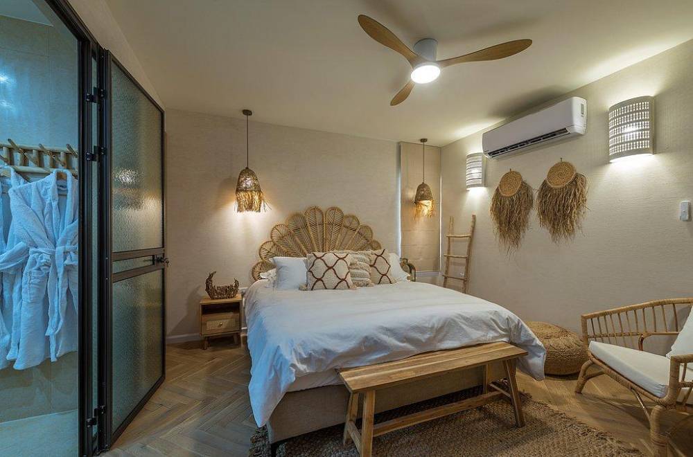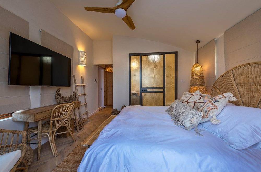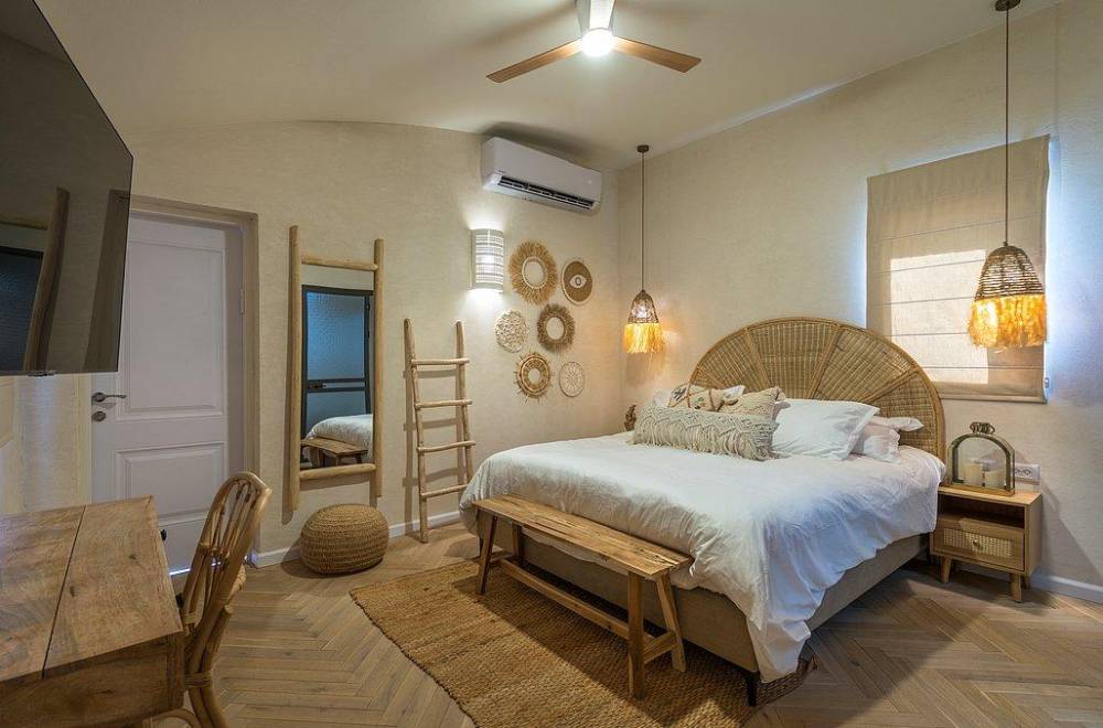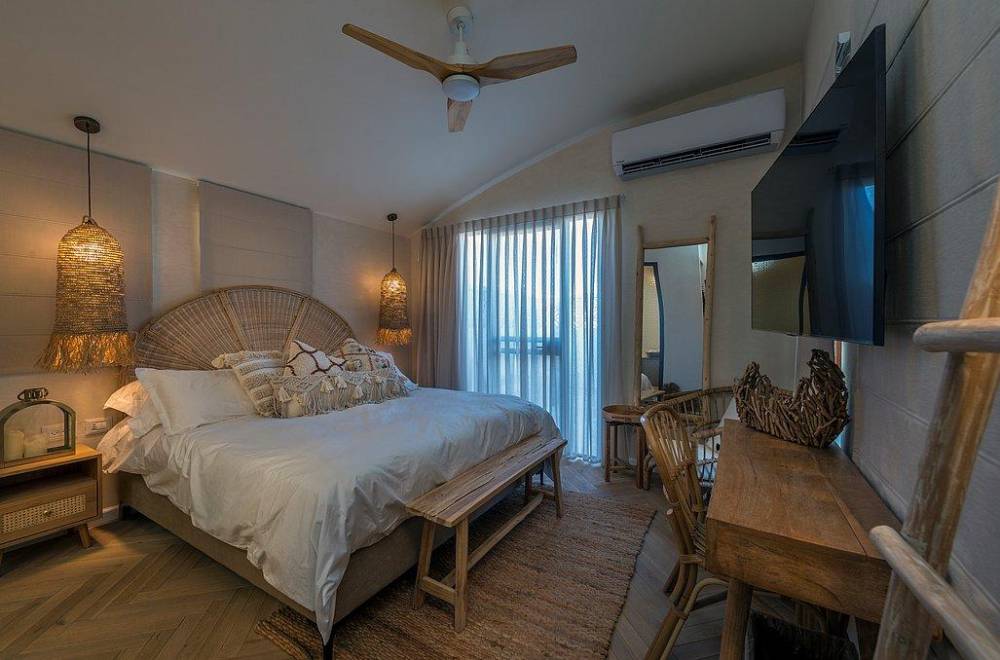 חדר שינה עם מיטה זוגית, מסך LCD, מיזוג אוויר, ארון, מגהץ, כספת ושידות,