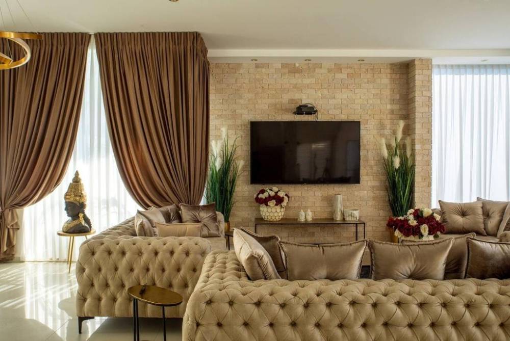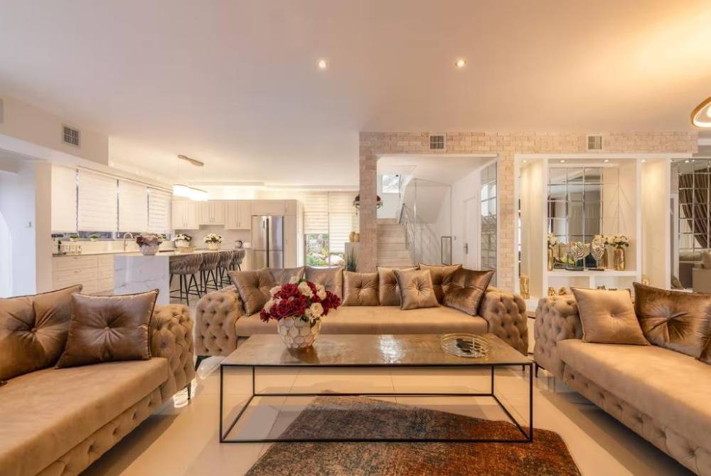 סלון גדול ומעוצב עם מערכת ישיבה מפוארת וטלוויזיה בגודל 70 אינץ'