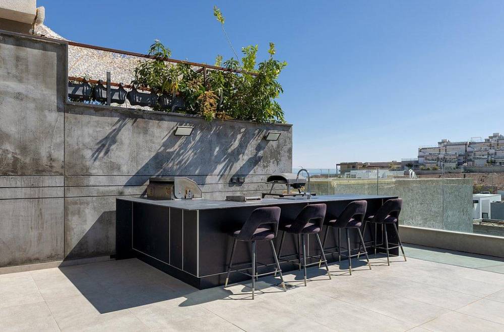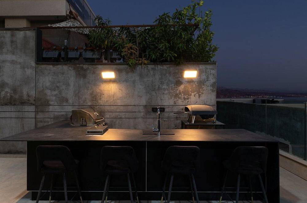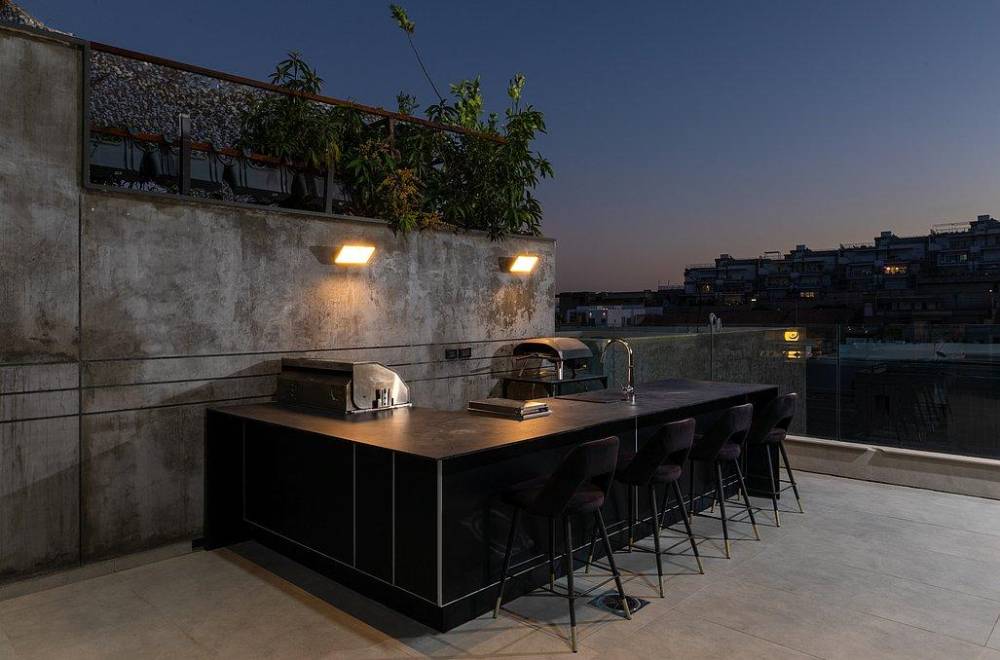 בר חיצוני עם מטבח הכולל עמדת מנגל גז, כיריים, טאבון, מכונת קרח מקרר וכיור.