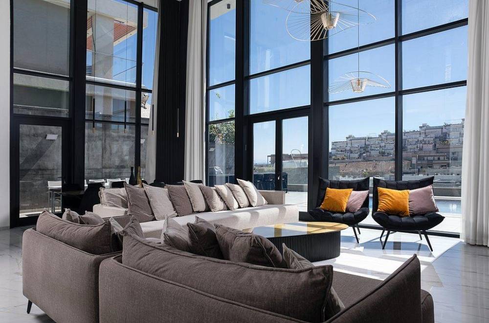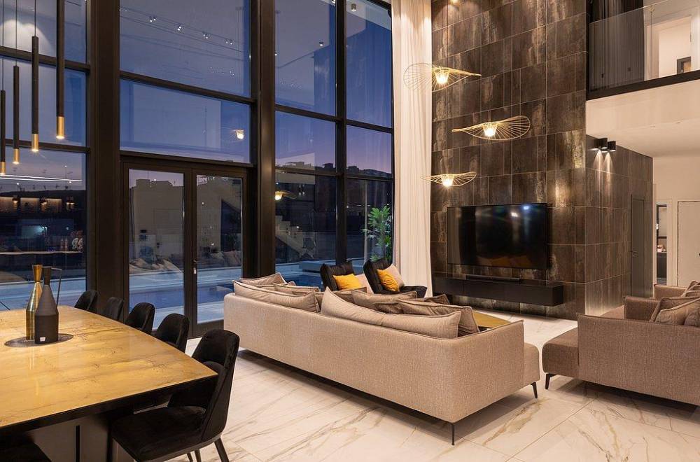 הסלון יוקרתי בעל קיר כוח עם חלל בגובה של 8 מטרים, טלוויזיה בגודל 98 אינץ' עם חיבור לyes, ספות גדולות ומרווחות, מערכות ישיבה איטלקים ופינת אוכל נפתחת המתאימה לכמות גדולה של אנשים.