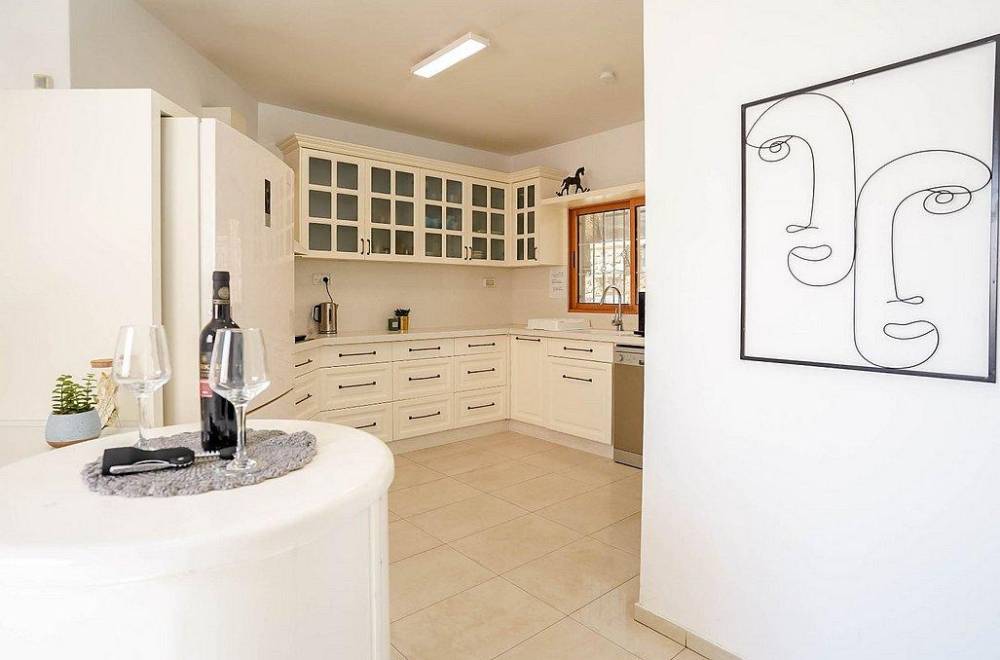 מטבח מאובזר הכולל: מקרר גדול, תנור אפייה, כיריים גז, מיקרוגל, קומקום חשמלי, מכונת אספרסו, כלי אוכל והגשה