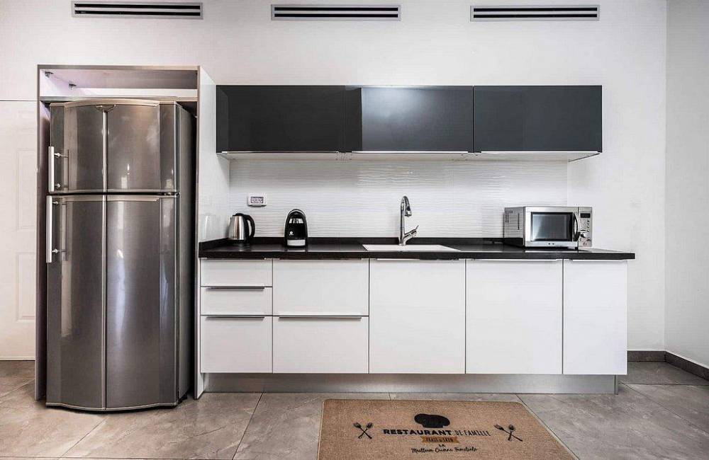 אבזור המטבח: מקרר, מיקרוגל, תנור אפיה, כיריים, מיחם ופלטה