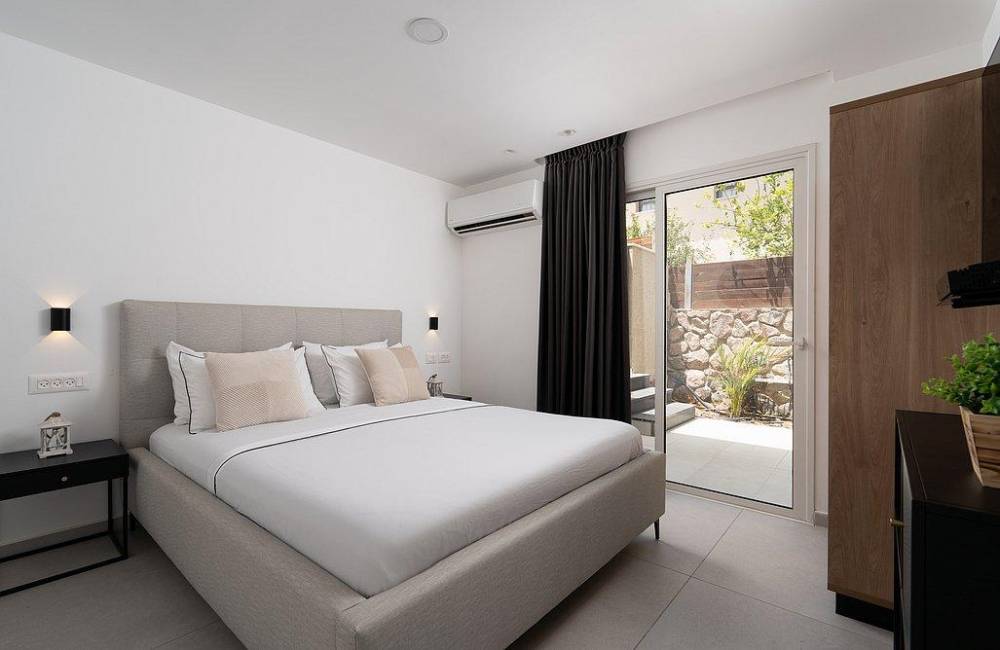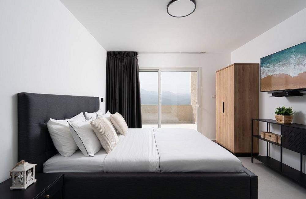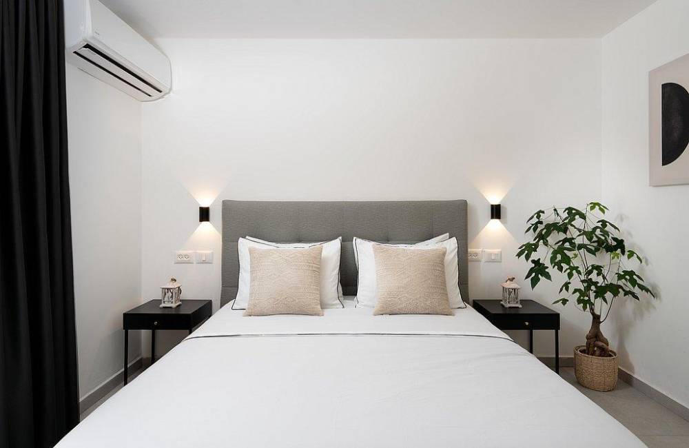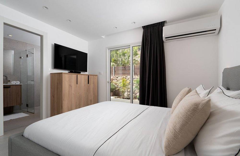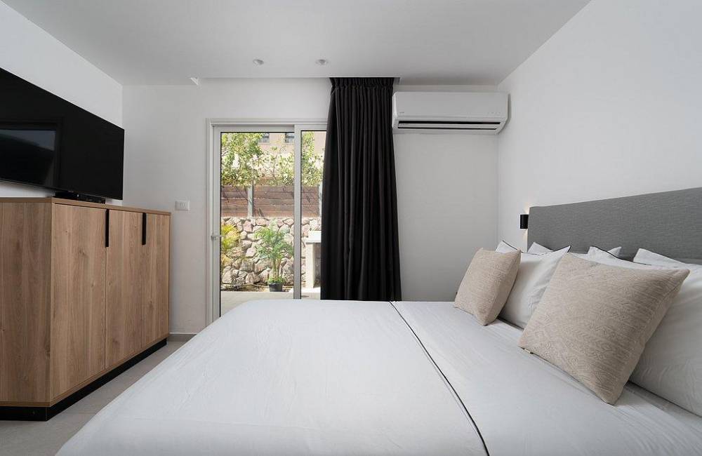 מיטה זוגית מוצעת, מיזוג אוויר, שידה, מסך LCD