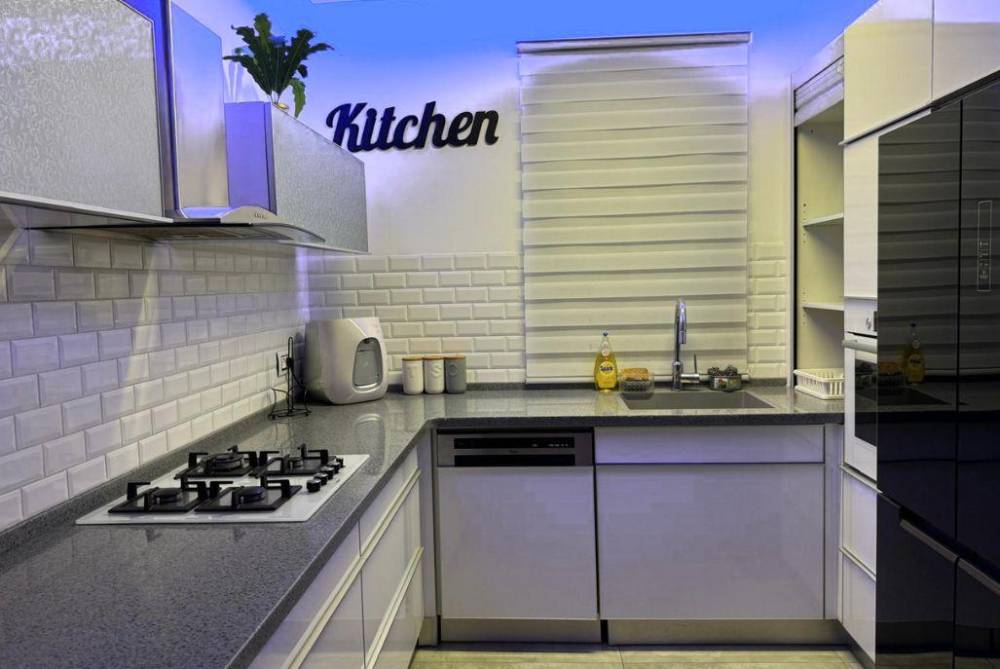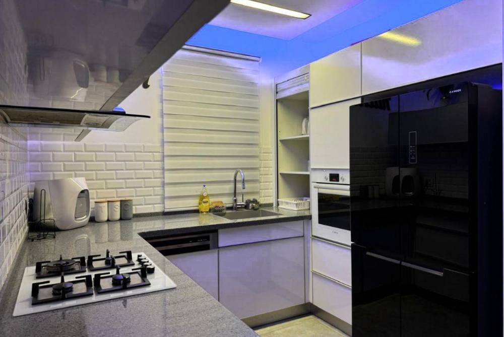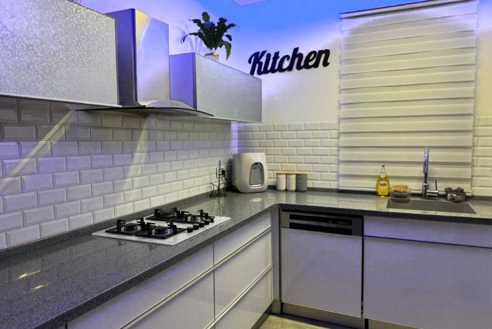 מטבח מאובזר ובו: מקרר, מיקרוגל, תנור אפייה, כיריים , מדיח כלים, כלי אוכל והגשה