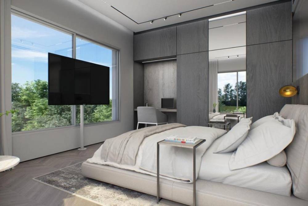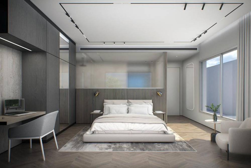 מיטה זוגית מוצעת ורחבה, ארונות או שידות, מיזוג אוויר, מסך צפייה ופינת ישיבה