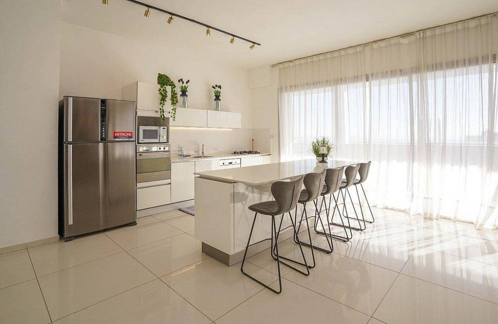 מטבח מאובזר + אי וכיסאות, פינת אוכל