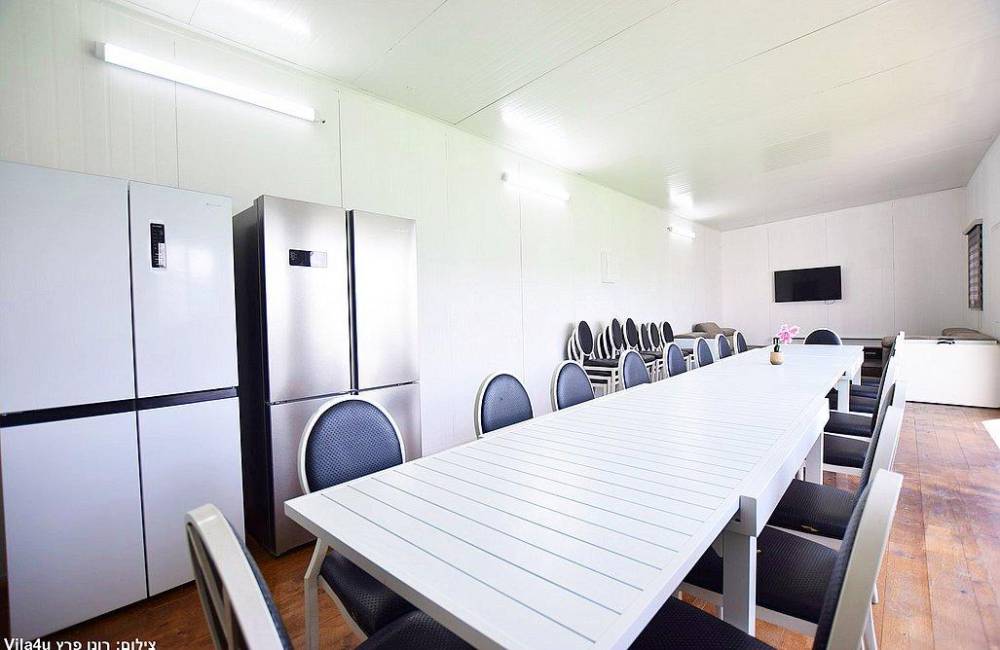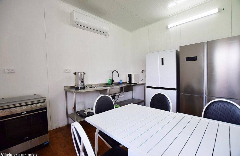 מטבח מאובזר הכולל: 2 מקררים, שולחנות וכיסאות, תנור וכיריים פינת קפה, פלטת שבת, קומקום חשמלי, טוסטר אובן ומיקרוגל.