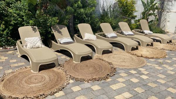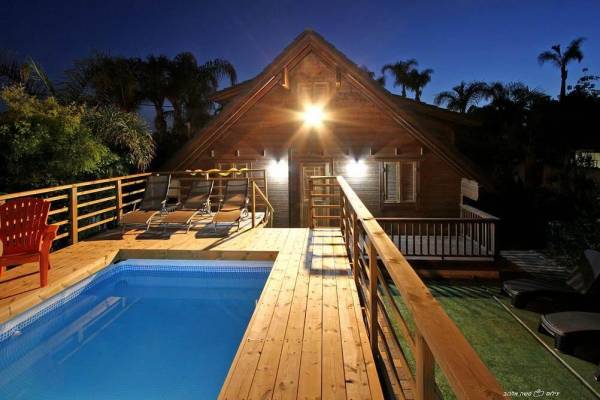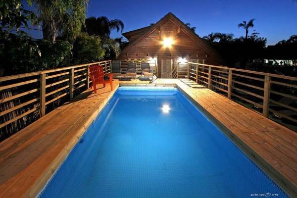 בריכת שחייה צלולה + מיטות שיזוף