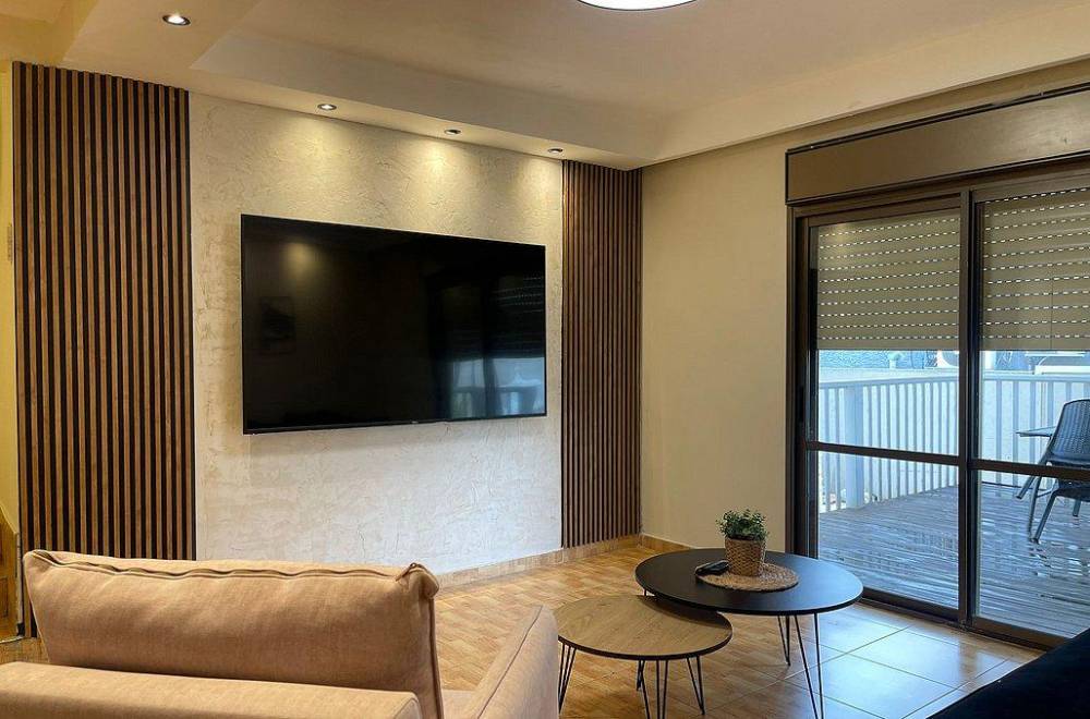 סלון אל מול מסך LCD בגודל 75 אינץ', חיבור לכבלים, ספה וכורסה