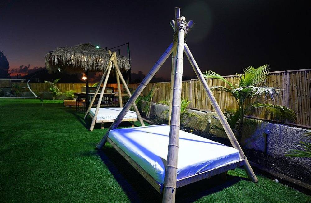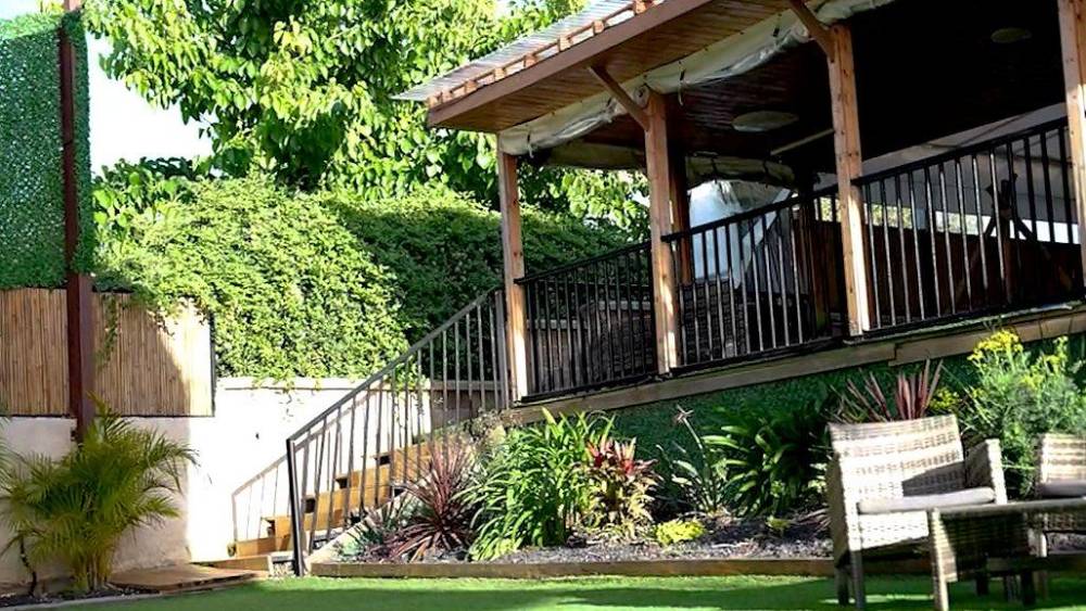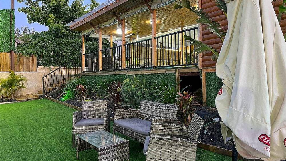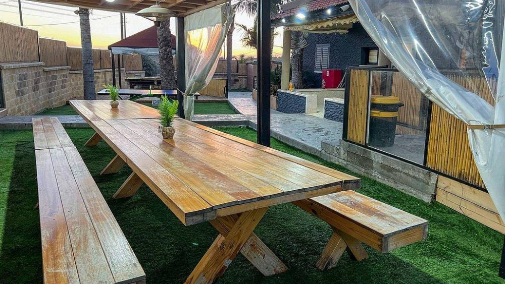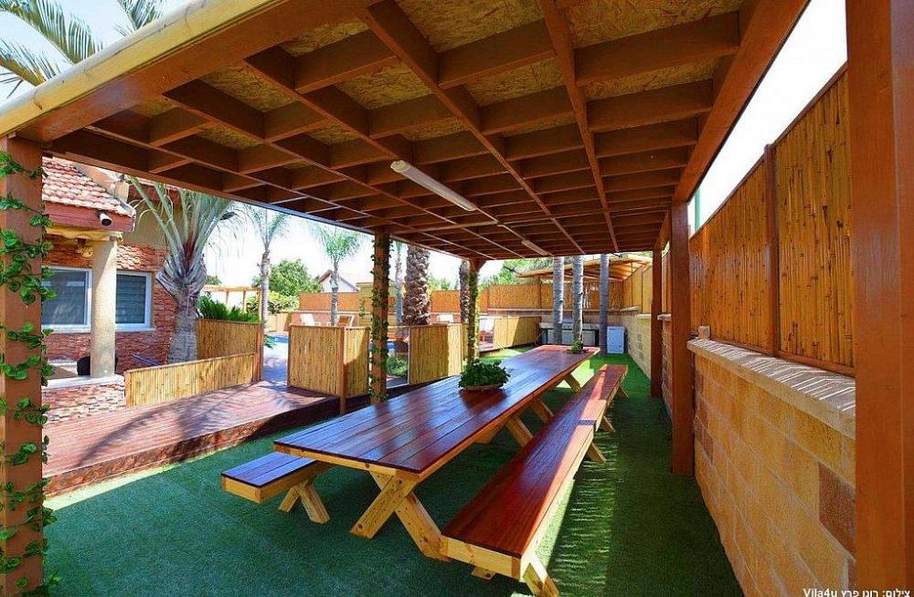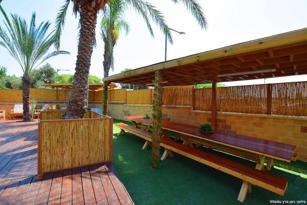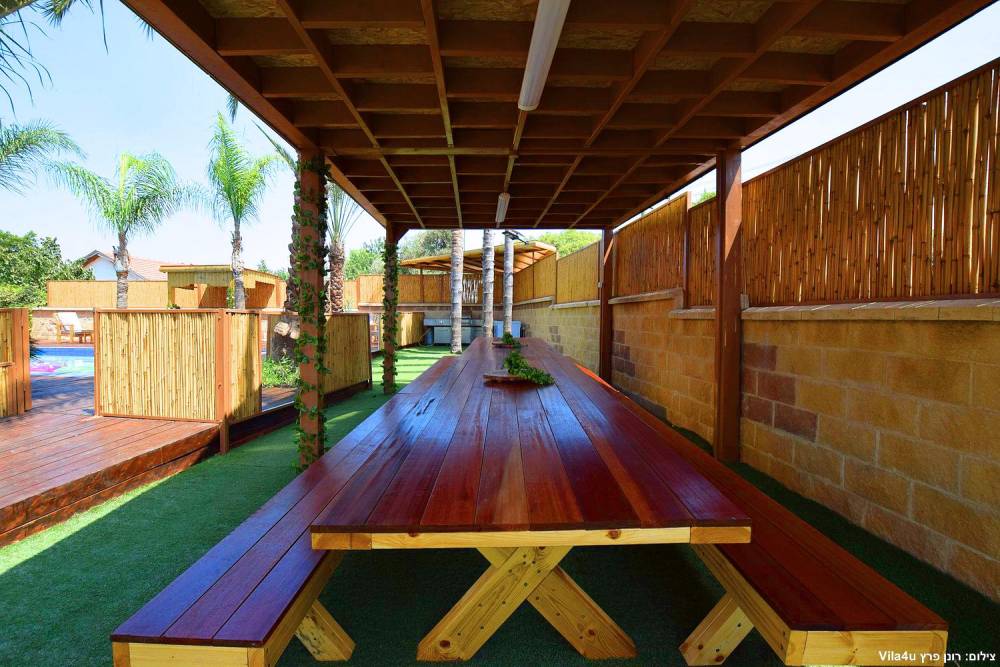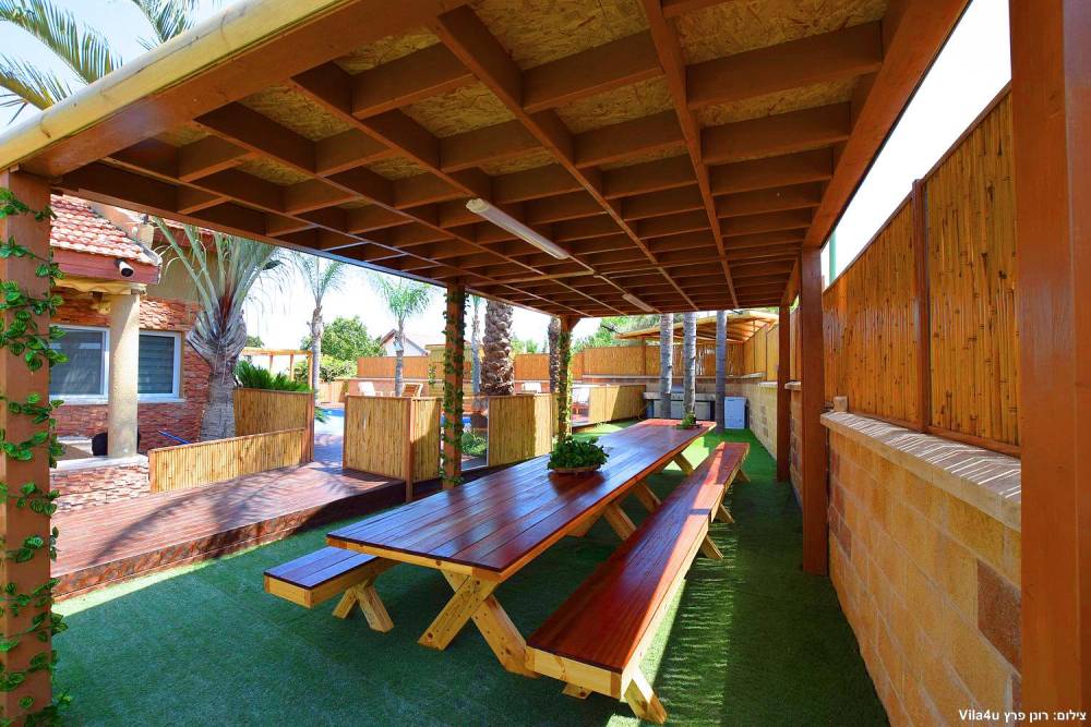 פינות ישיבה, מיטות שיזוף ושולחן גינה עם ספסל מקורה