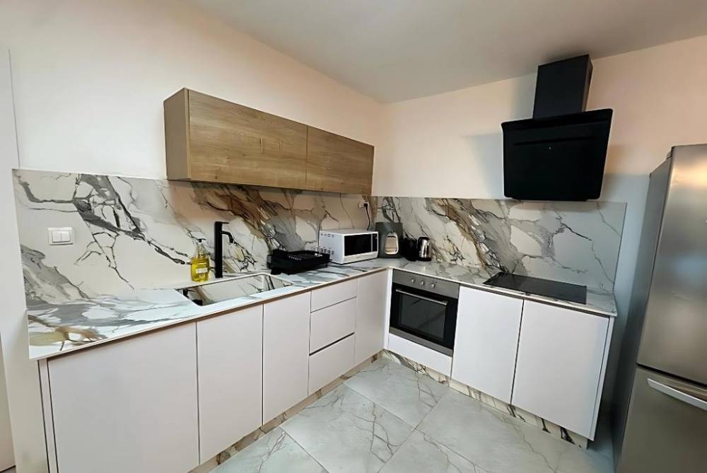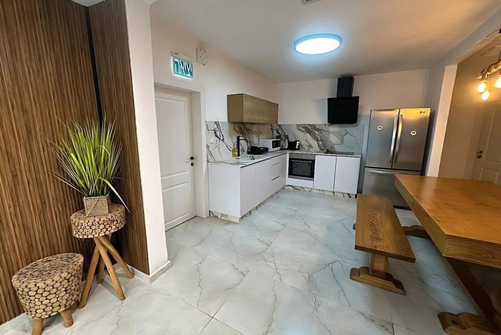 מטבח מאובזר הכולל מקרר, כיור, תנור, מיקרוגל, כיריים גז, מנדף, תמי 4, כלי אוכל והגשה.