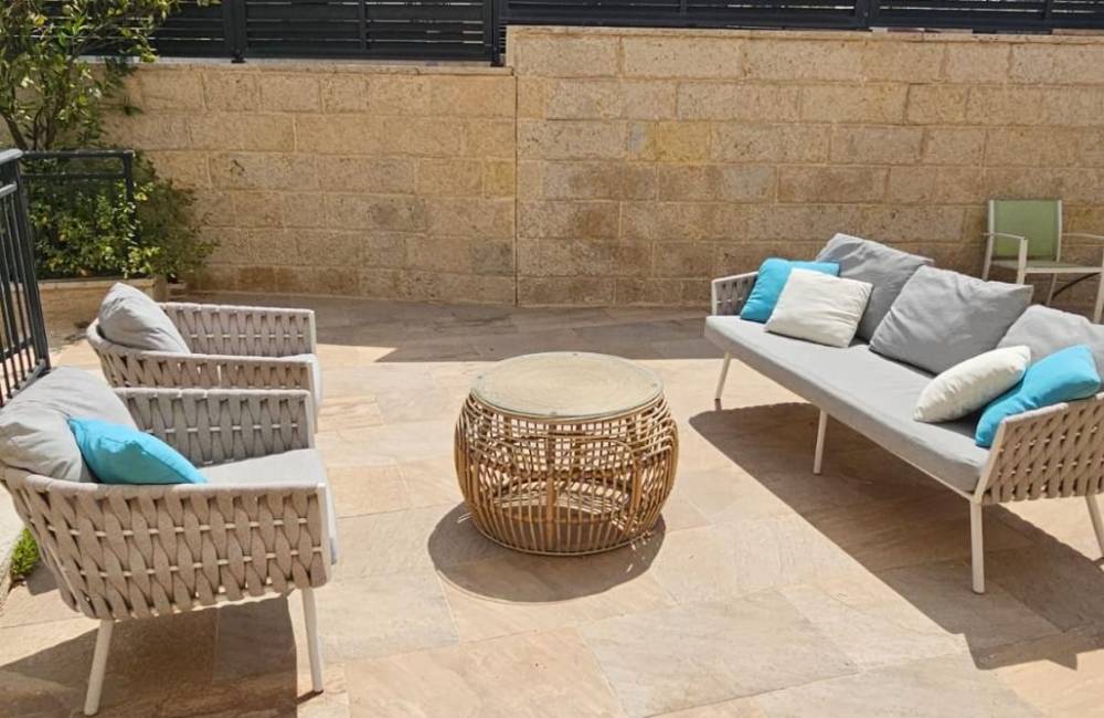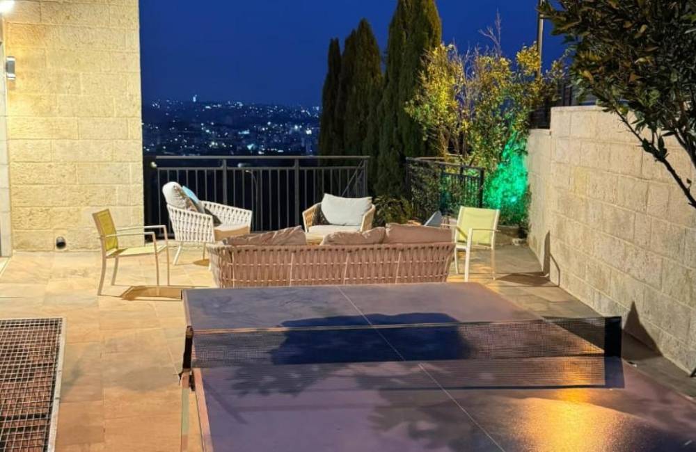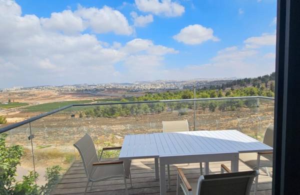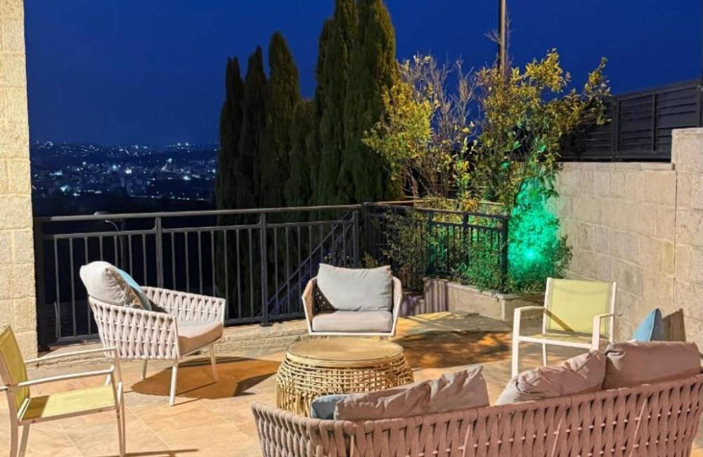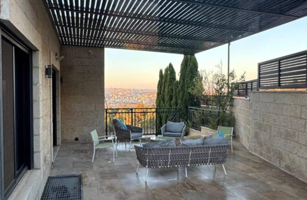 ביציאה מהסלון קיימת מרפסת היקפית עם יציאה לרצפת דק, פינת מנגל, ריהוט גן ונוף מדהים להרי ירושלים
