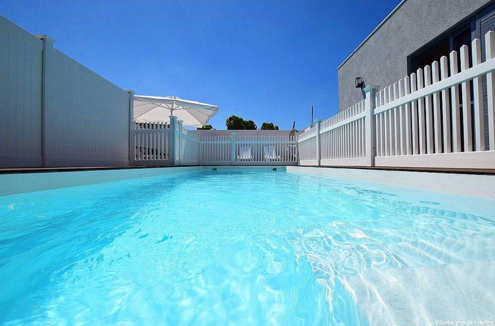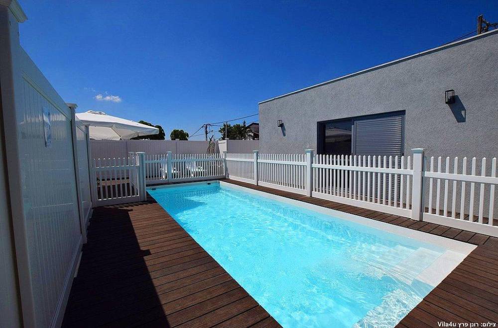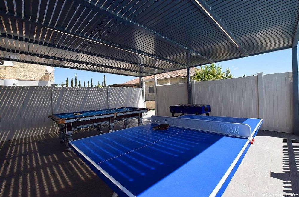 חצר גדולה עם בריכת שחייה (מחוממת ומקורה), ג'קוזי ספא, פינת מנגל, שולחן סנוקר מקצועי, שולחן פינג פונג ושולחן כדורגל