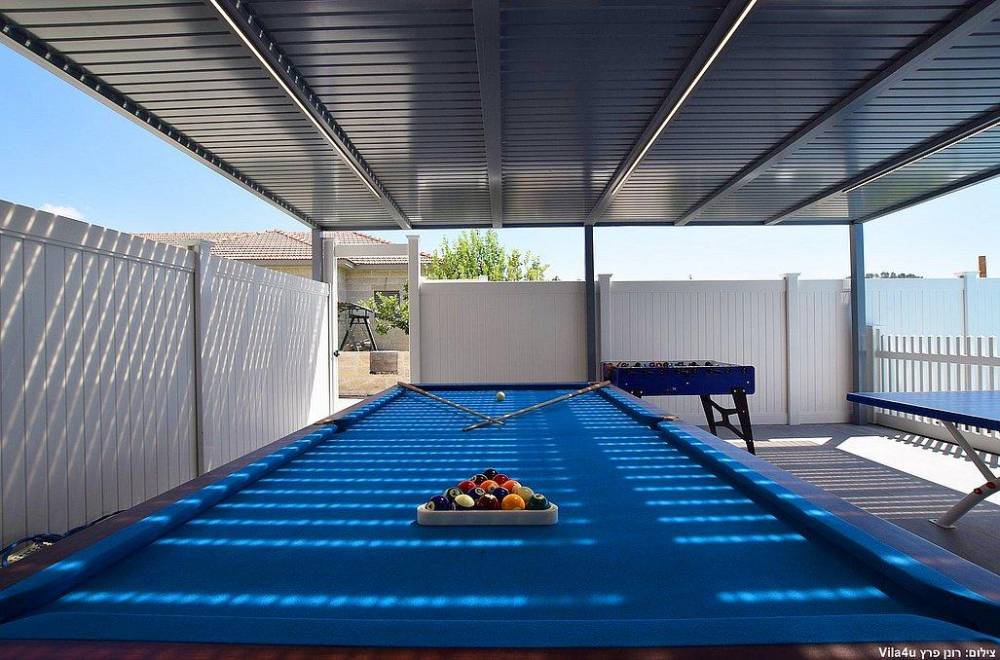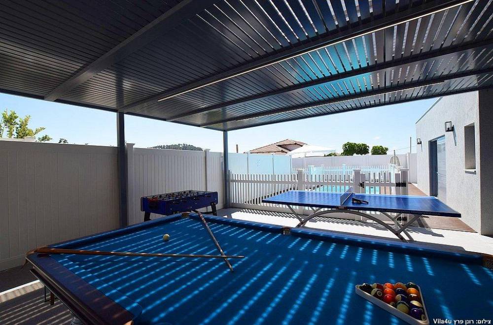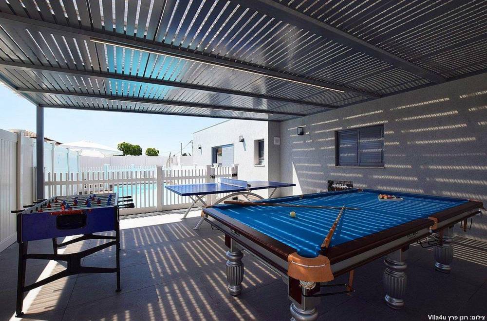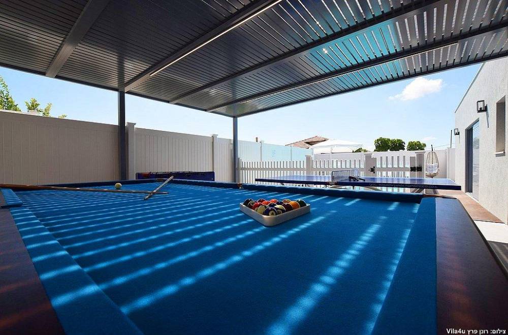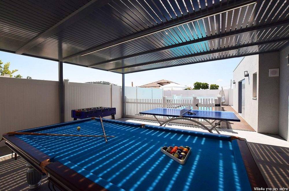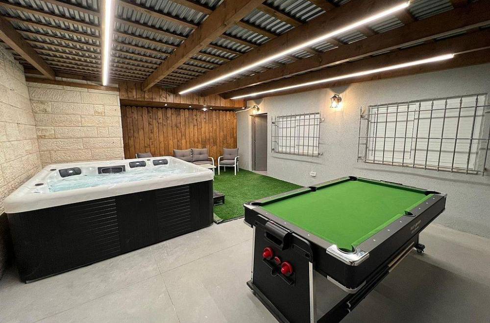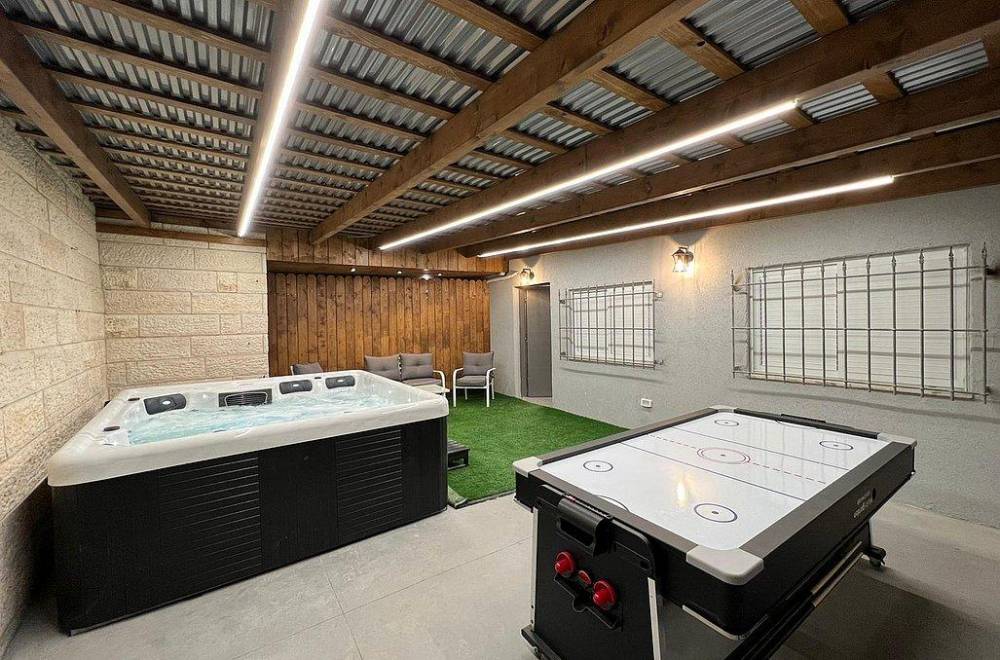 חצר עם ג'קוזי ספא, פינת מנגל, שולחן סנוקר והוקי אוויר