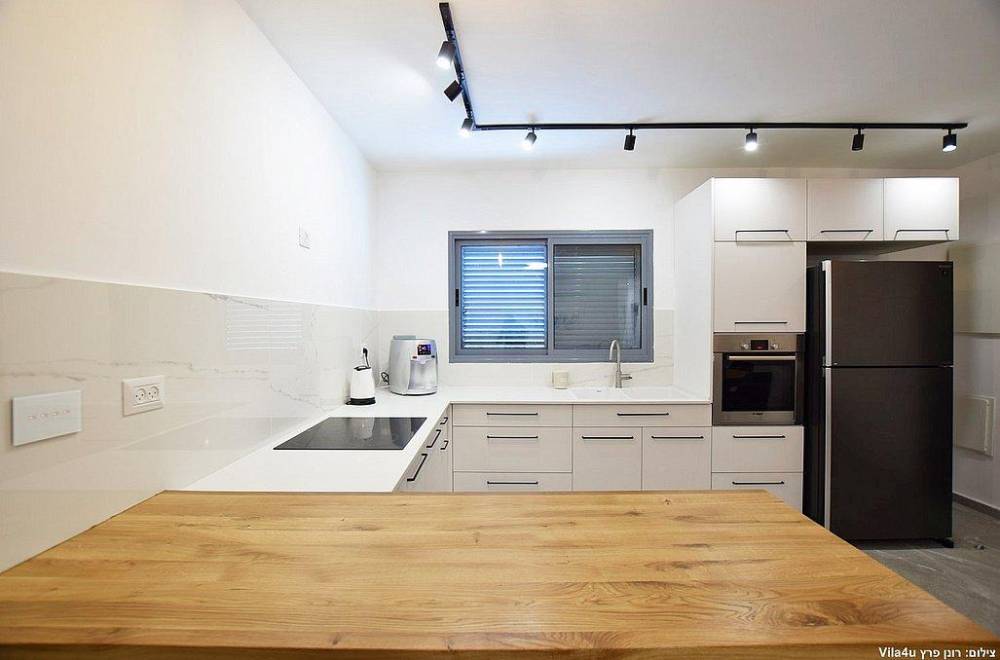 מטבח מאובזר הכולל מקרר, כיור כפול, כיריים חשמליות, תנור אפייה, מתקן מים, כלי אוכל והגשה