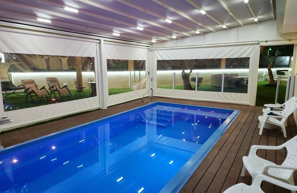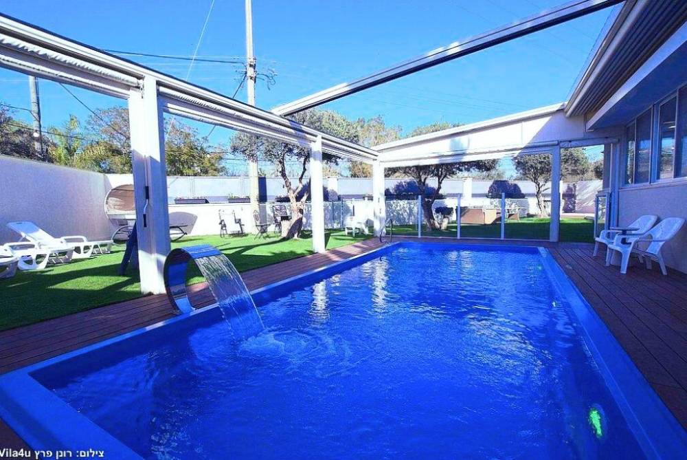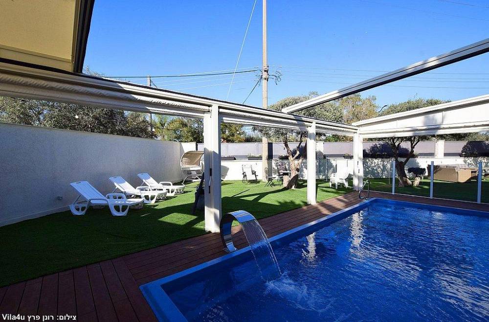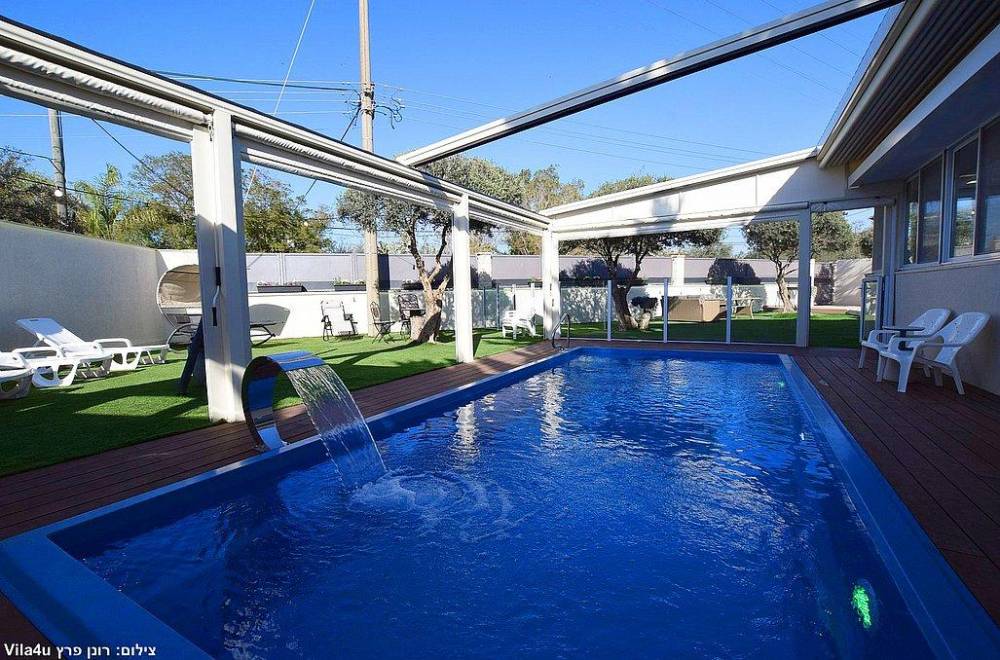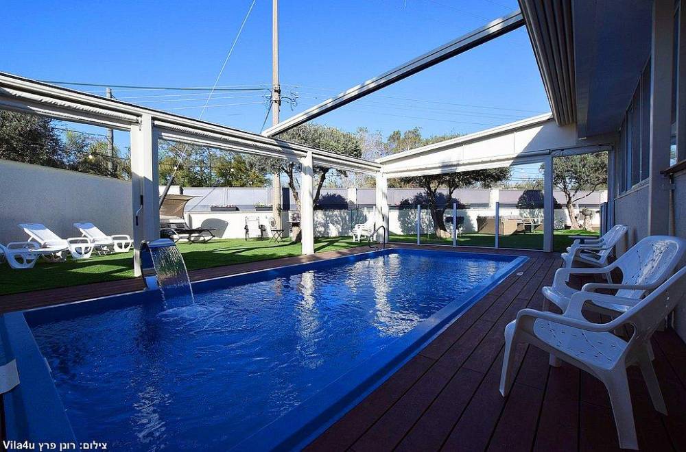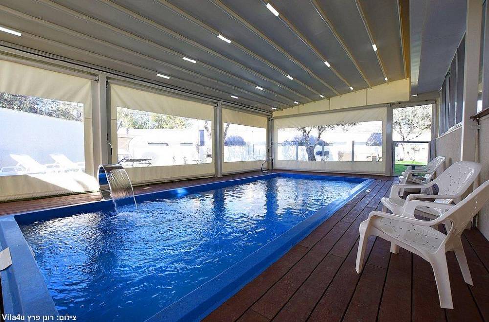 בריכת שחייה בגודל 7X3 עם מפל מים, הבריכה מחוממת מקורה בחודשי החורף וכוללת סוכך חשמלי נפתח ונסגר