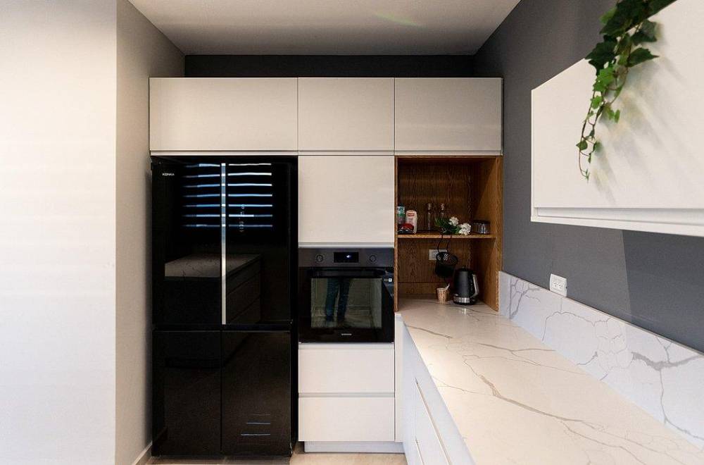 מטבח מאובזר הכולל מקרר, תנור, כיריים גז, מיקרוגל, קומקום, כלי אוכל והגשה.