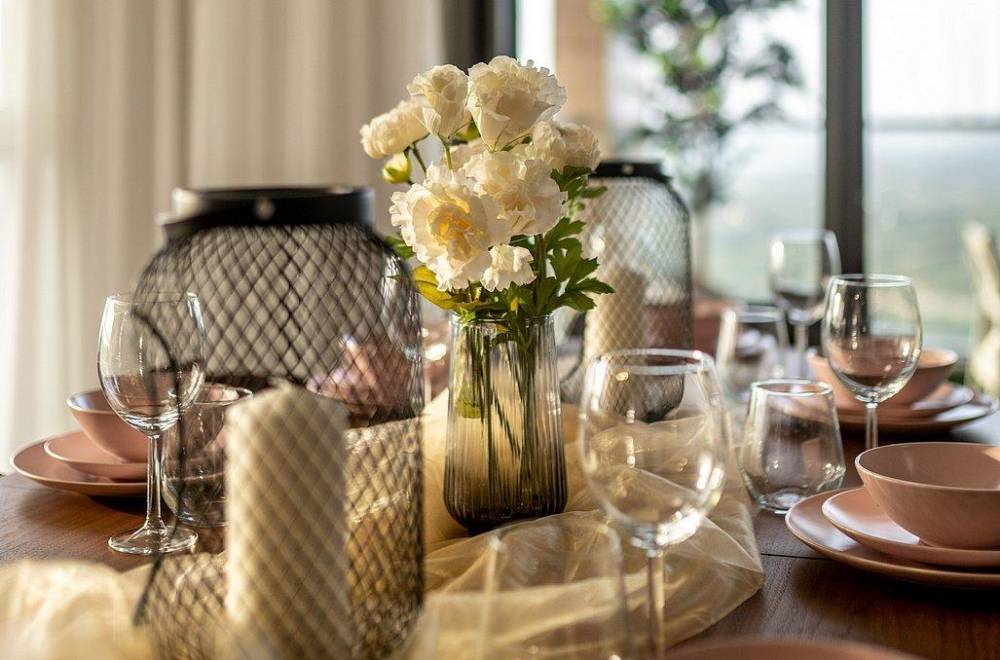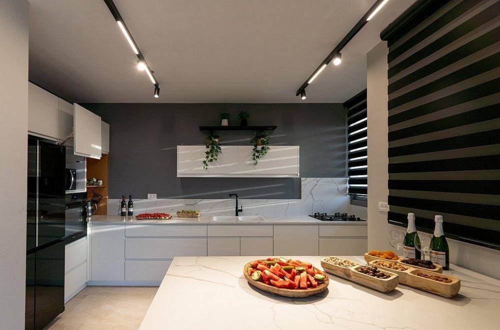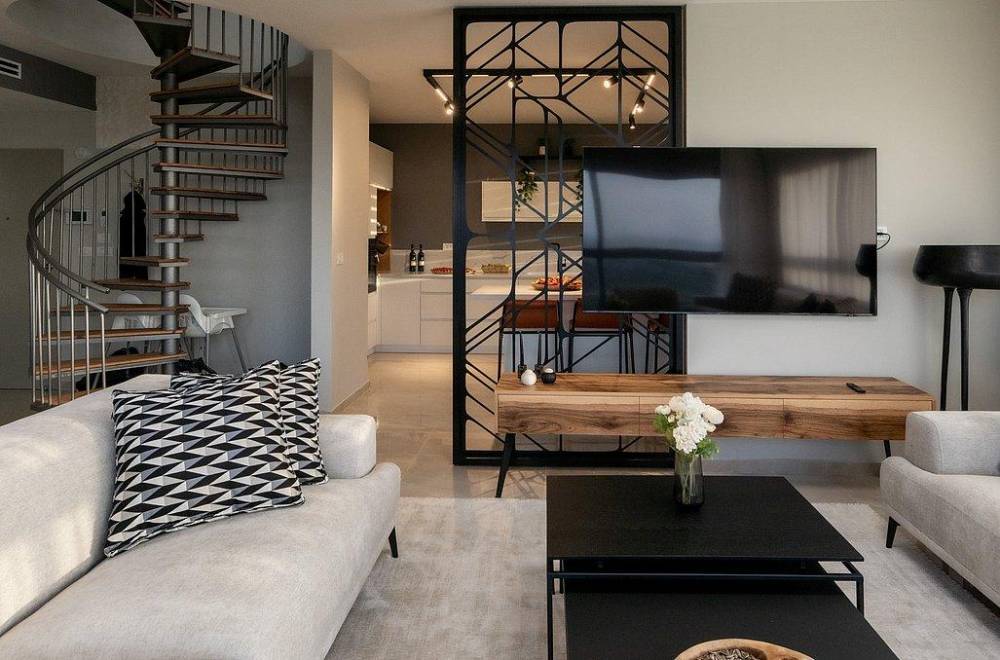 סלון מעוצב ומרווח עם מערכת ישיבה וטלוויזיה בגודל 75 אינץ'