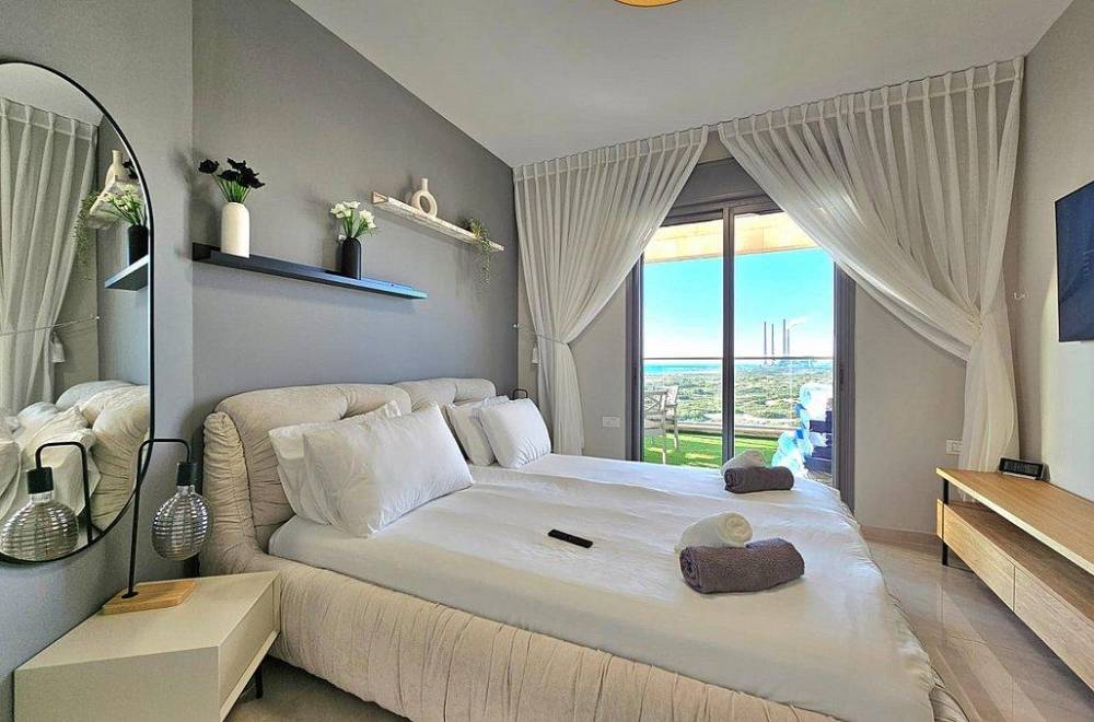 חדר שינה 1 - מיטה זוגית בגודל 200X200 מטר, 2 מזרני יחיד, לול לתינוקות, מיזוג אוויר, טלוויזיה, שידות אחסון, חדר רחצה פרטי ונוף מדהים.