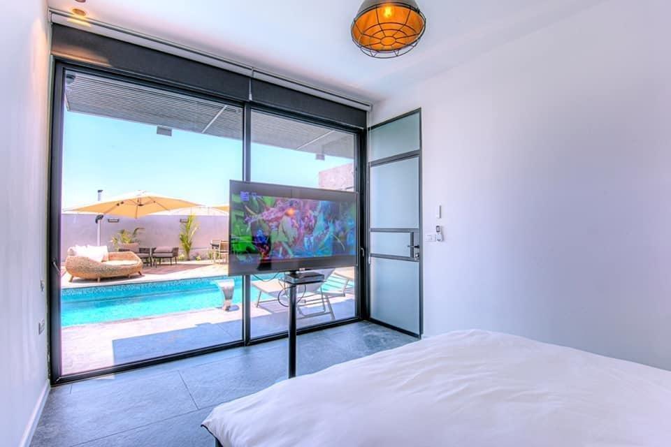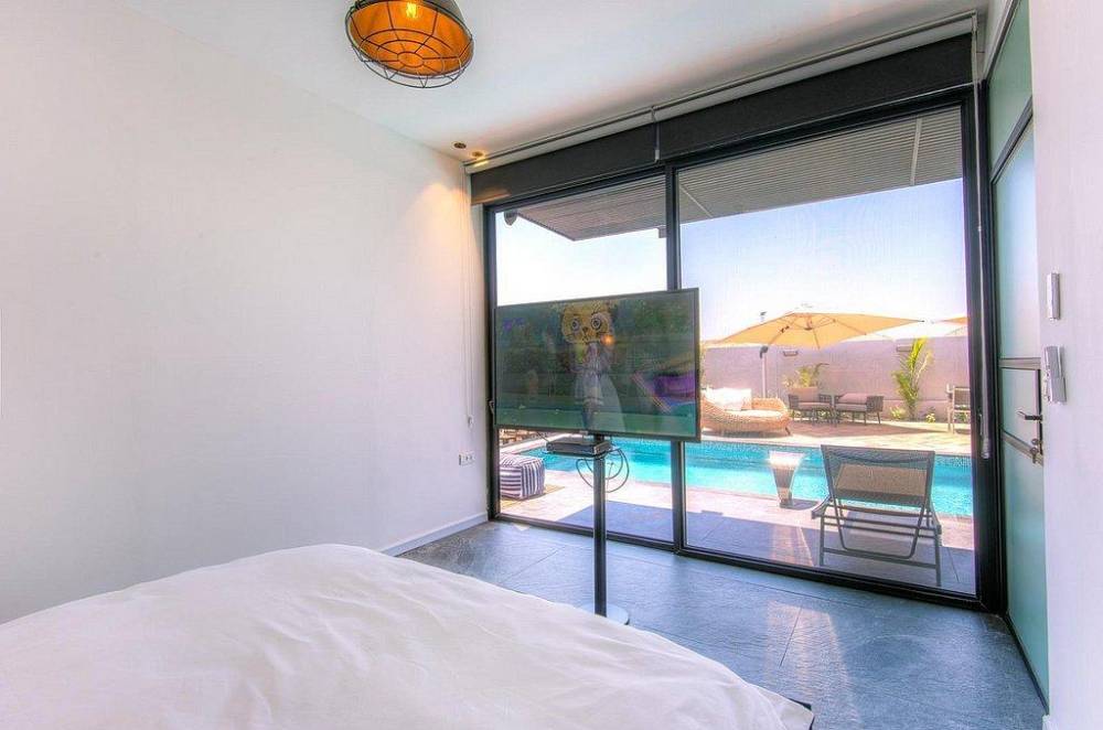 3 חדרי שינה – מסך טלוויזיה, מיטה זוגית, מזגן, שידות, ויטרינה עם וילונות חשמליים מול הבריכה