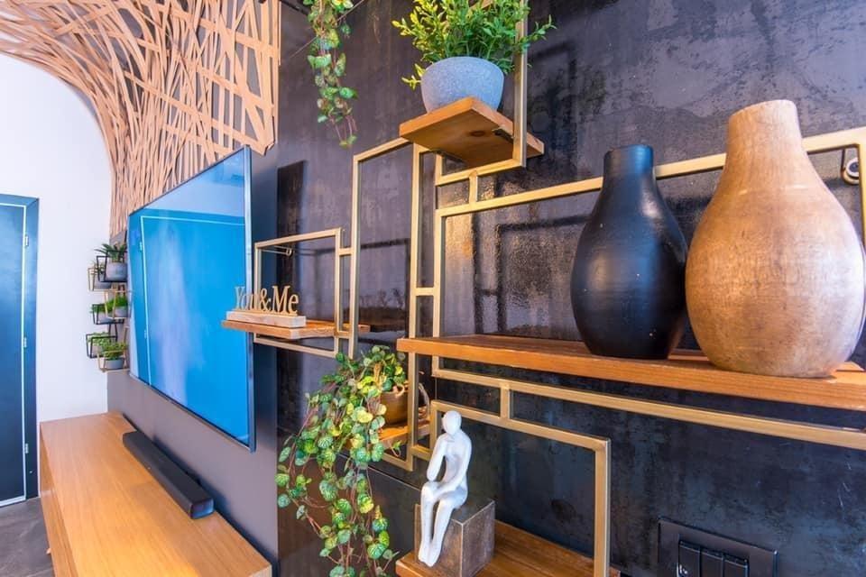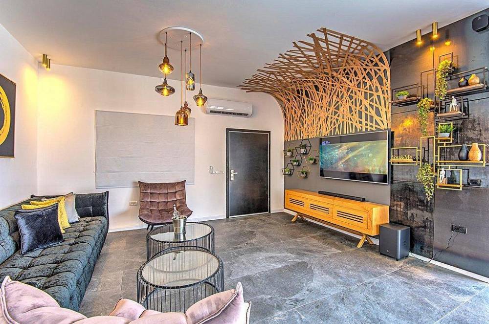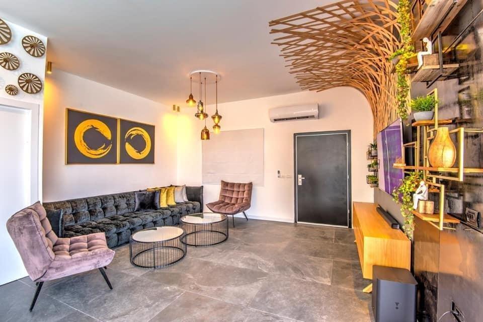 סלון יוקרתי ומודרני עם מערכות ישיבה איכותיות, תאורה מדהימה ומסך טלוויזיה