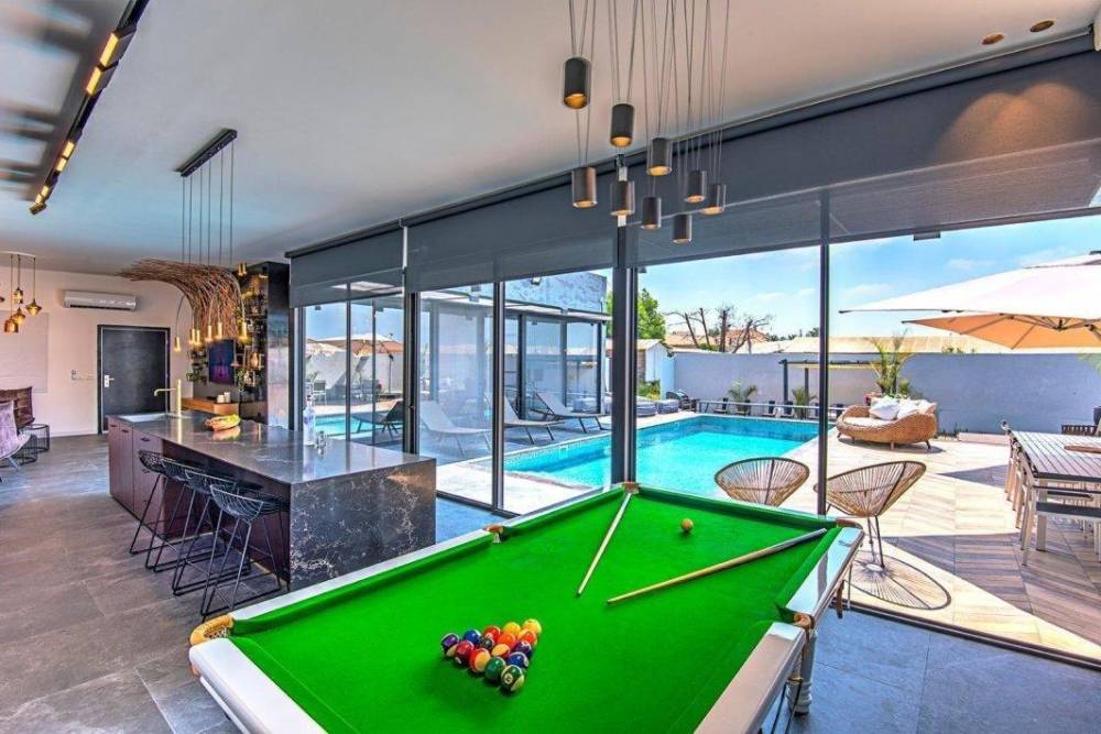 לצד האי והמטבח ניצב שולחן סנוקר מקצועי ומולו מסך LCD