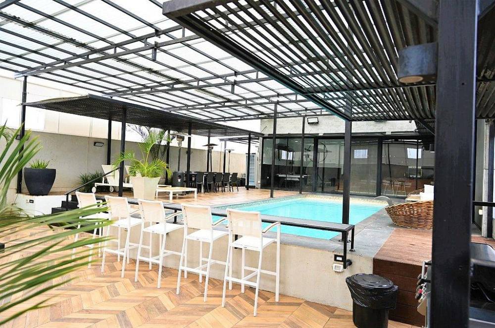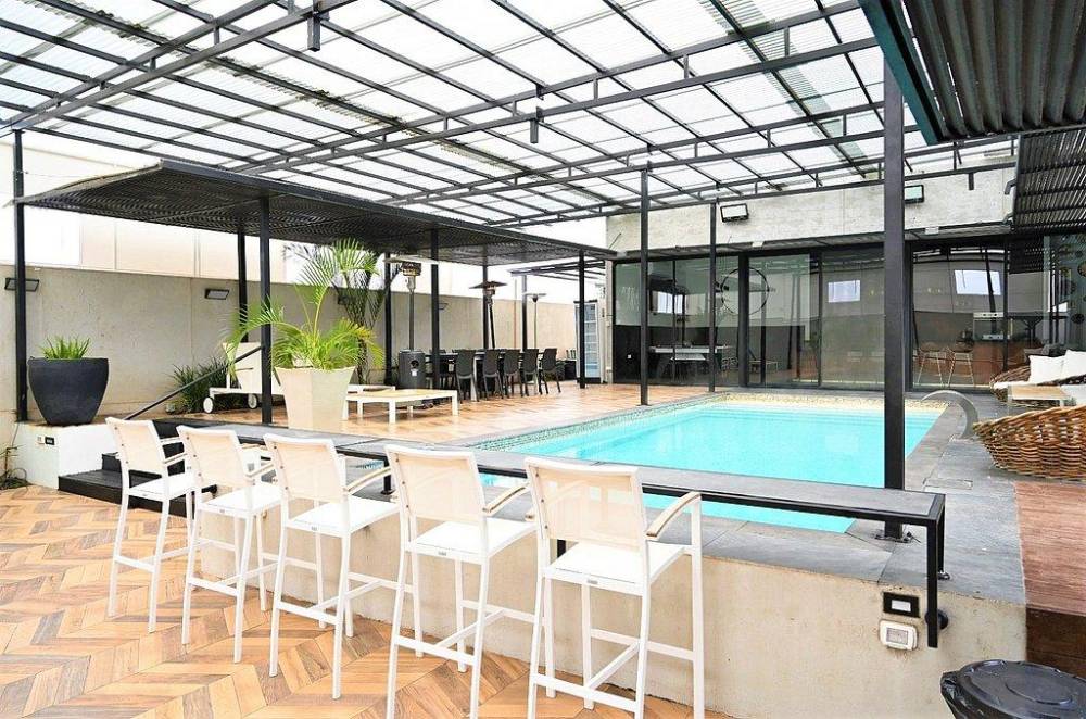 בר מובנה עם כיסאות ישיבה גבוהים מול הבריכה