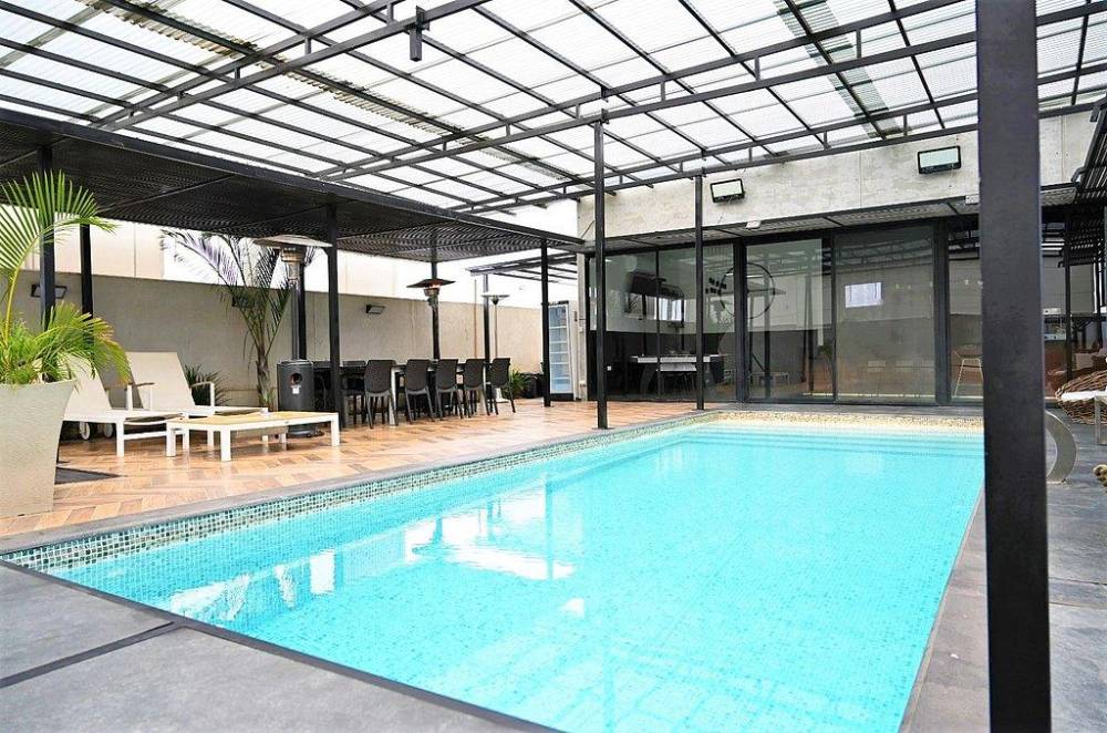 חצר יפיפייה עם מדשאות, בריכת שחייה מחוממת, מקורה ומקצועית מחופה דק עץ מדהים