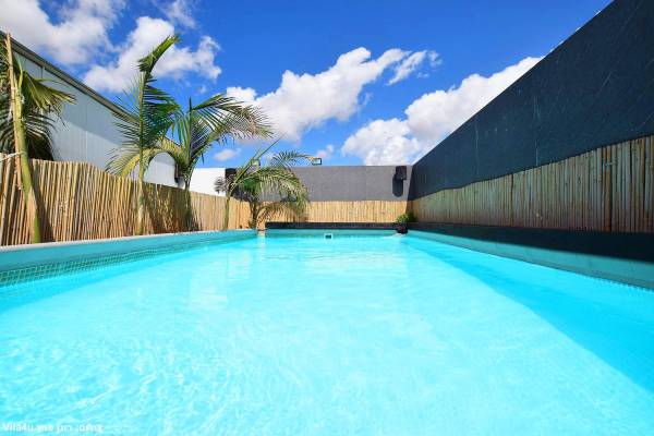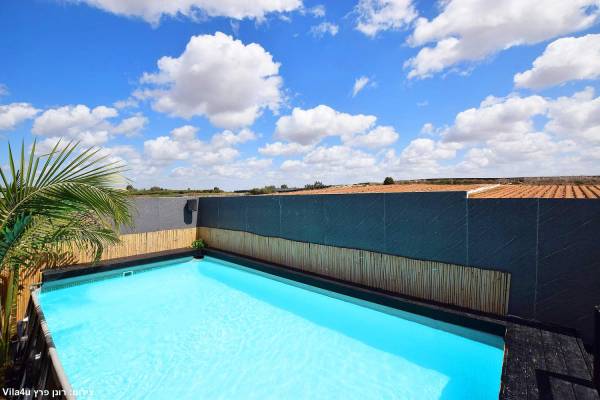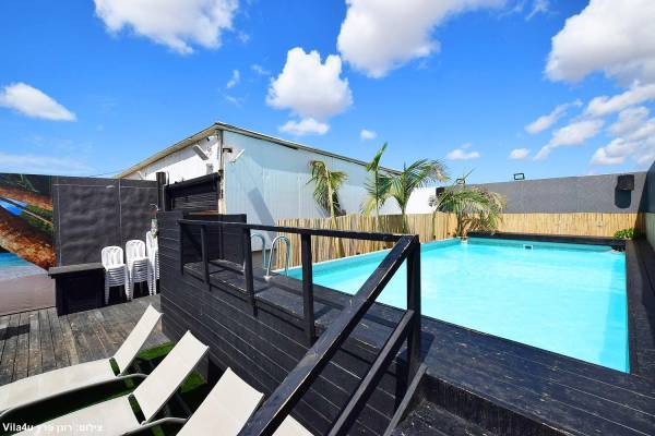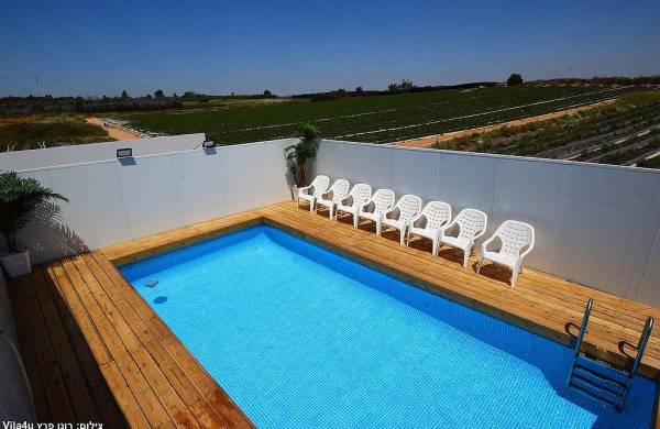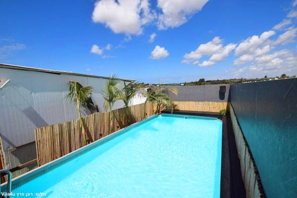 בריכת שחייה מחופה בדק עם מיטות שיזוף