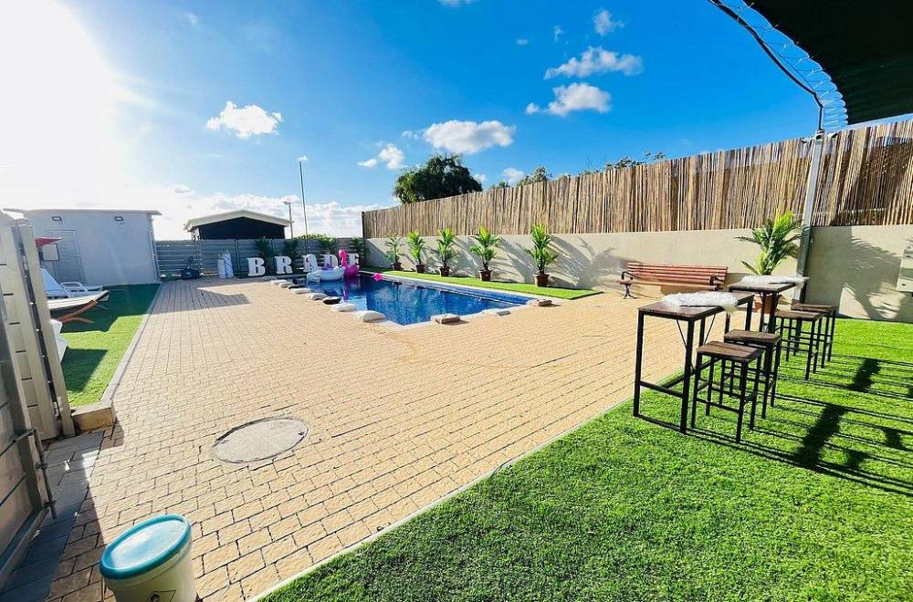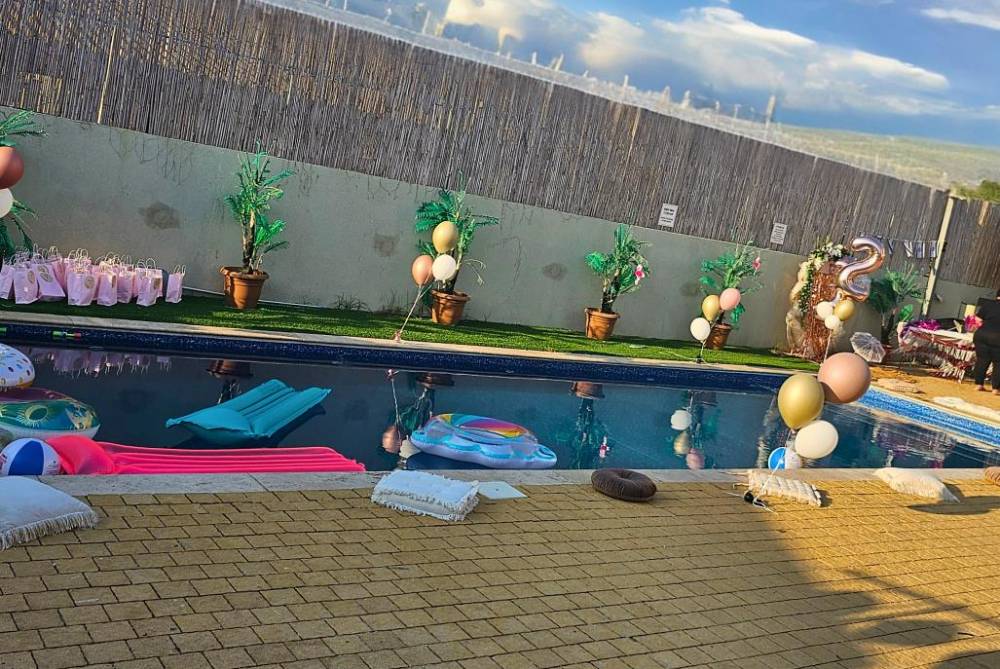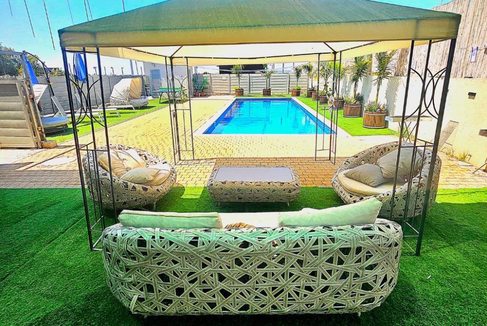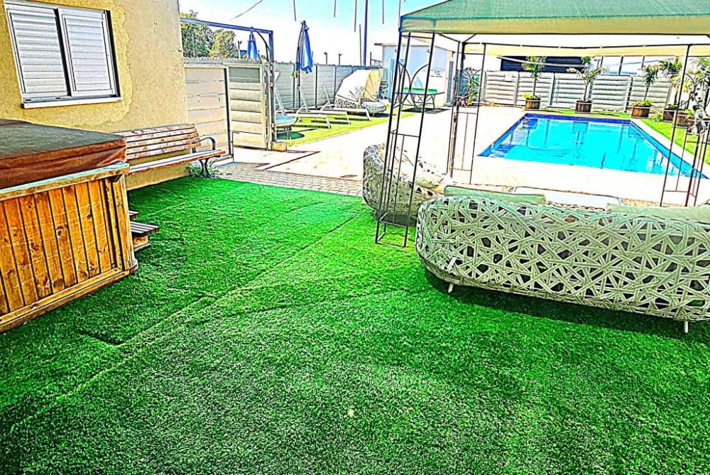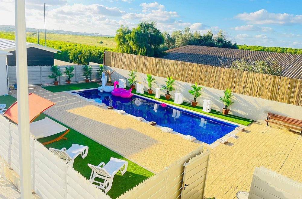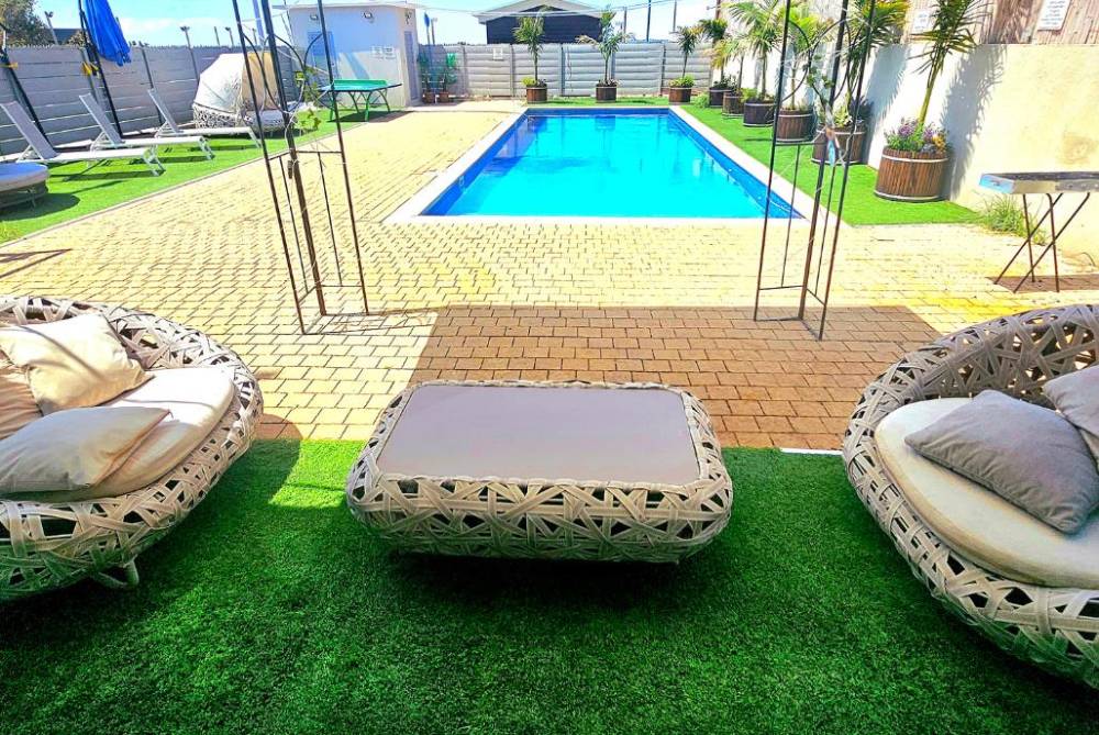 בנוסף, קיים חצר גדולה עם בריכת שחייה (מחוממת, בנוייה ומגודרת בגודל 4.5X12 מטר), ג'קוזי מפנק, פינת מנגל, מקרר גדול, מערכת שמע, חדר רחצה, פינות ישיבה ומיטות שיזוף.