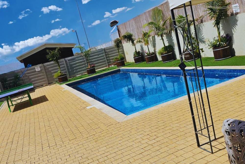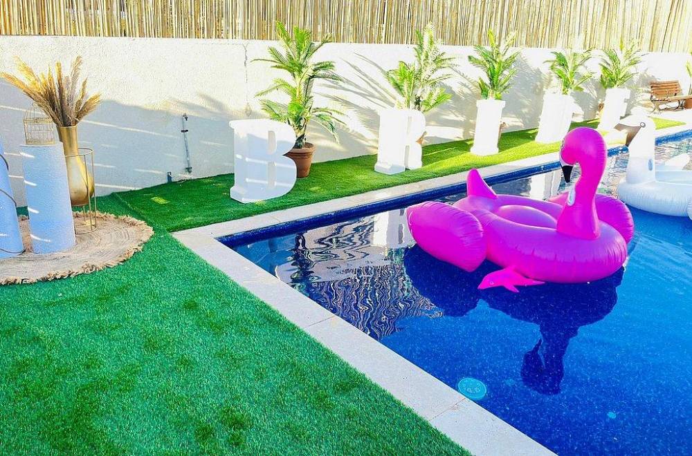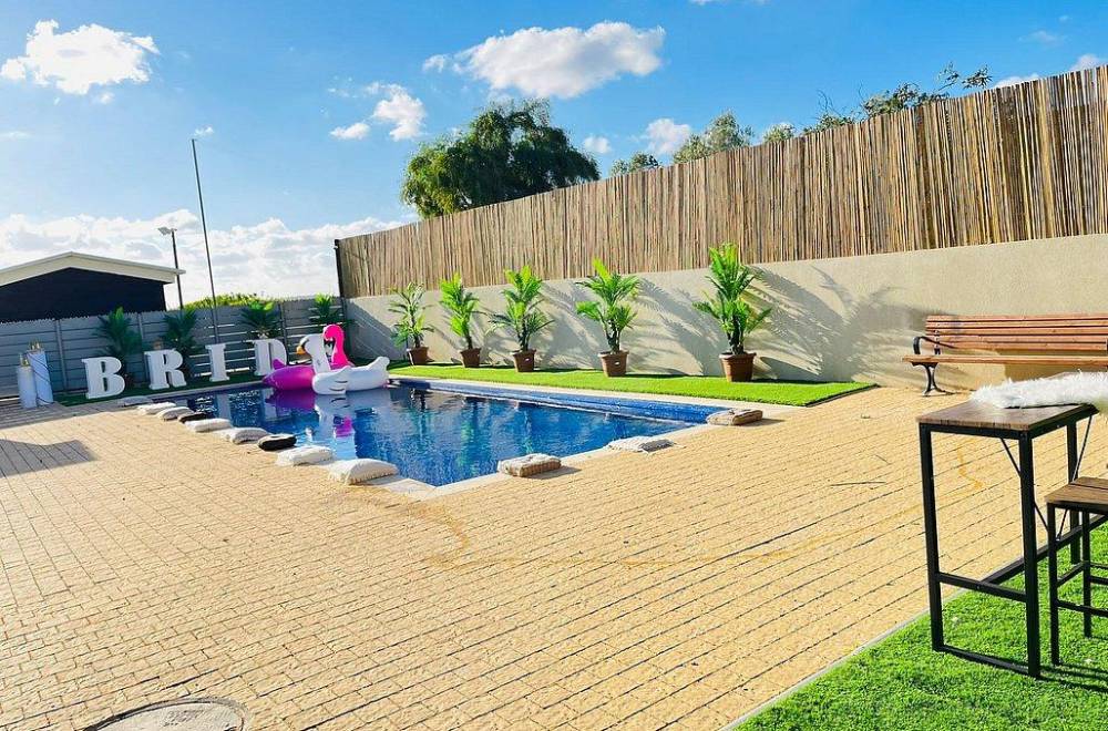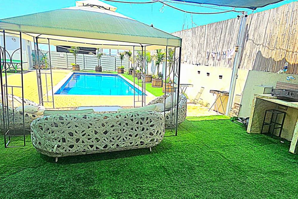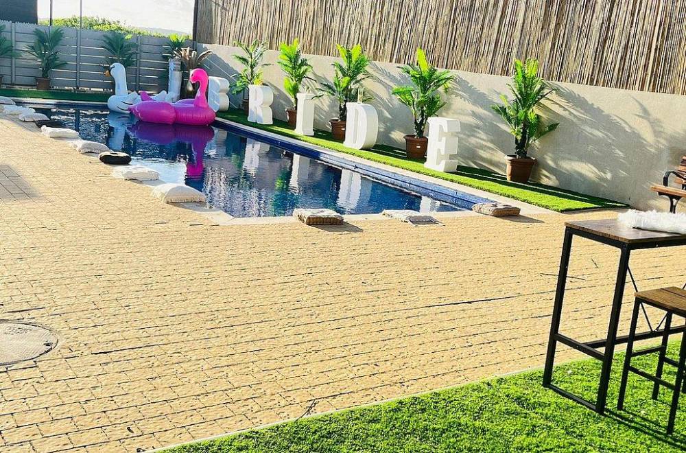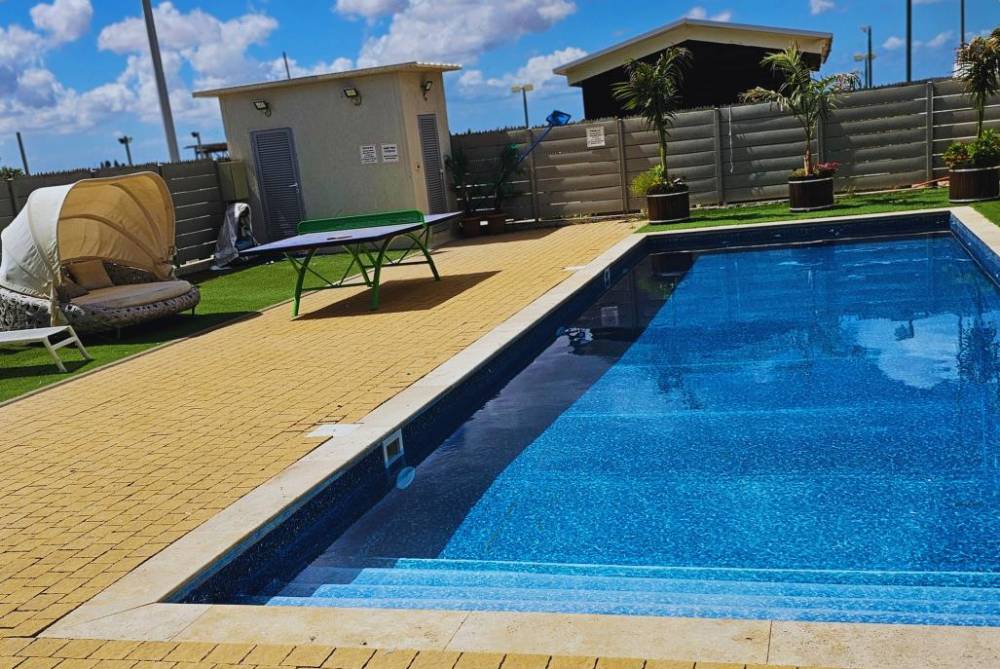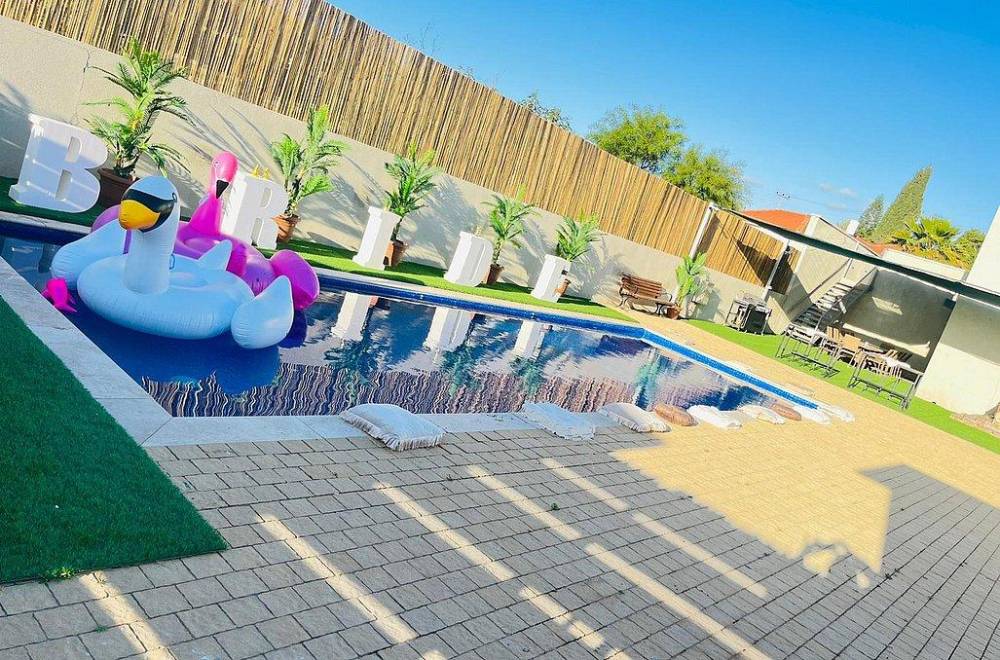 בנוסף, קיים חצר גדולה עם בריכת שחייה (מחוממת, בנוייה ומגודרת בגודל 4.5X12 מטר), ג'קוזי מפנק, פינת מנגל, מקרר גדול, מערכת שמע, חדר רחצה, פינות ישיבה ומיטות שיזוף.