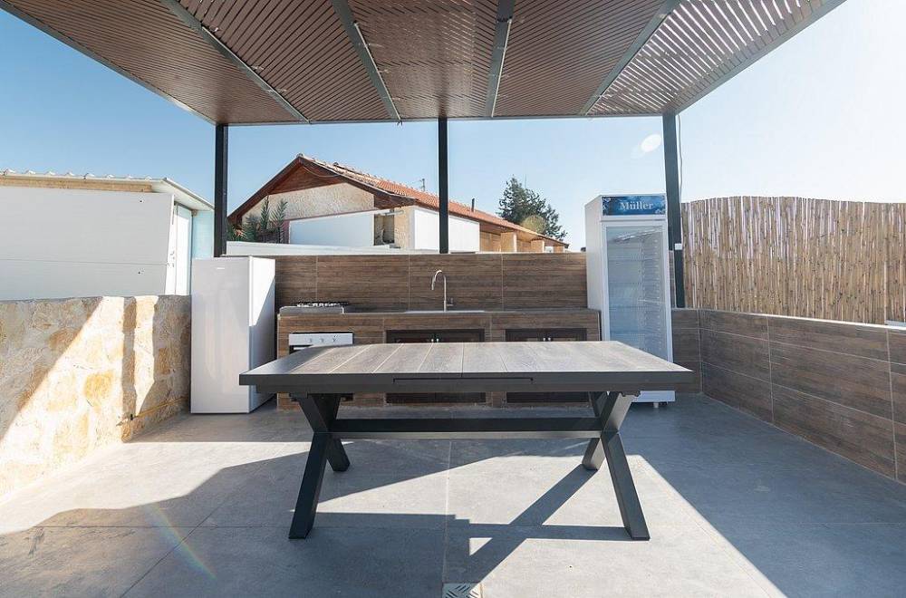 מטבח חוץ מאובזר עם משטח עבודה, 2 כיורים, מקרר,  מקפיא כיריים גז ותנור אפייה