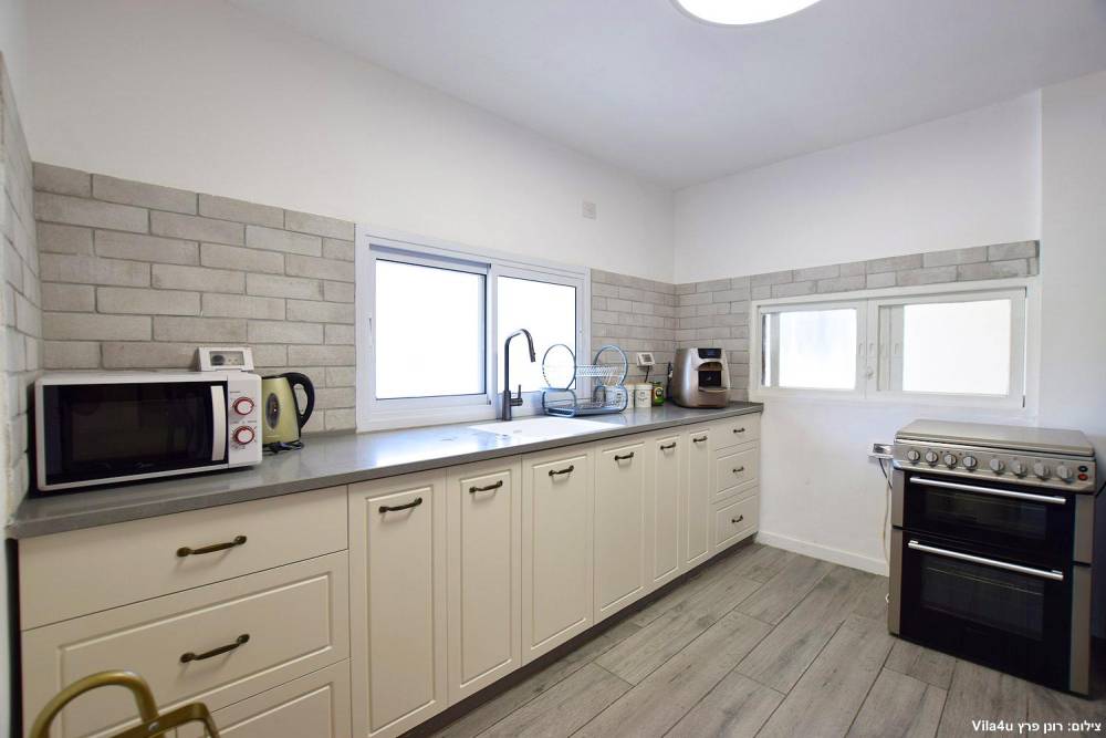 מטבח מאובזר הכולל מקרר, תנור, כיריים, מיקרוגל, תמי4, כלי אוכל והגשה