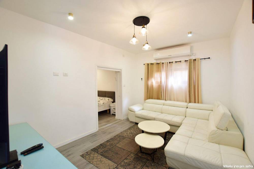 סלון גדול ומרווח אל מול מסך טלוויזיה עם חיבור לערוצים