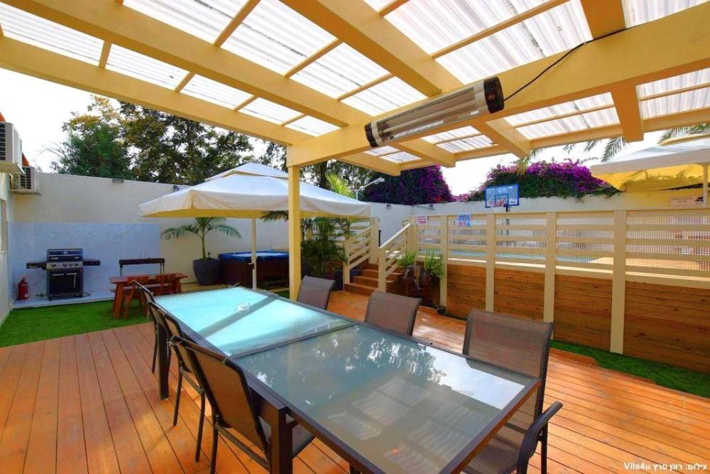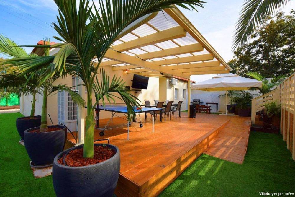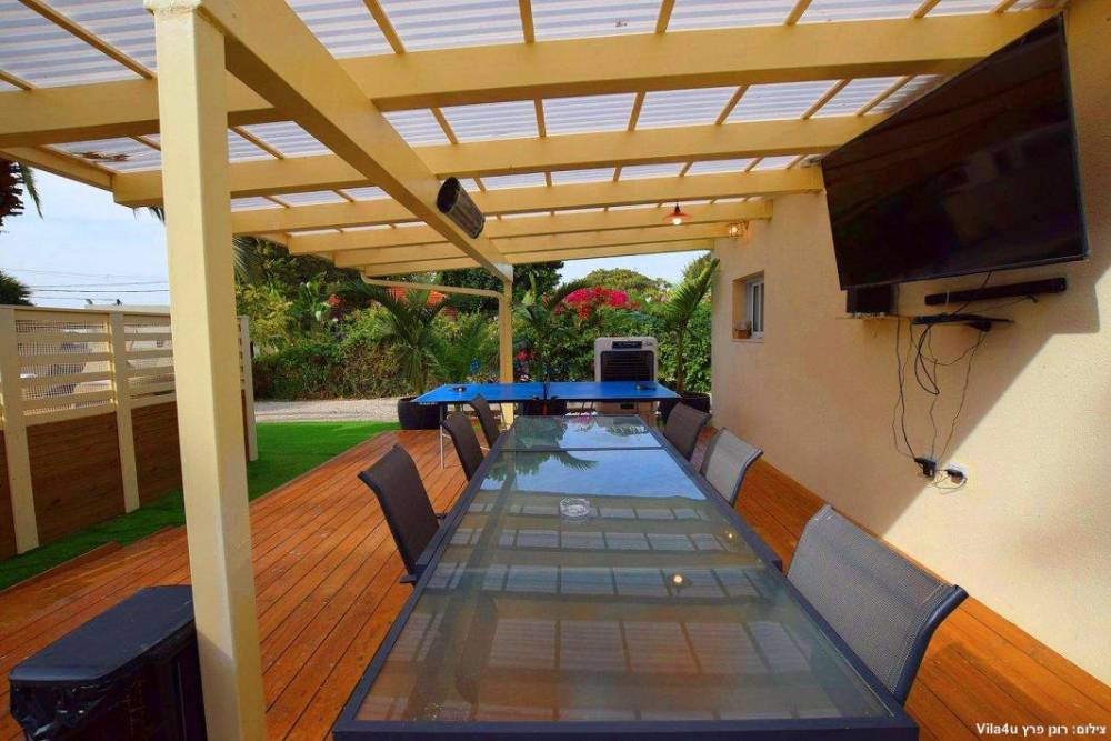 פרגולה גדולה עם פינת אוכל ומסך צפייה בגודל 65 אינץ'