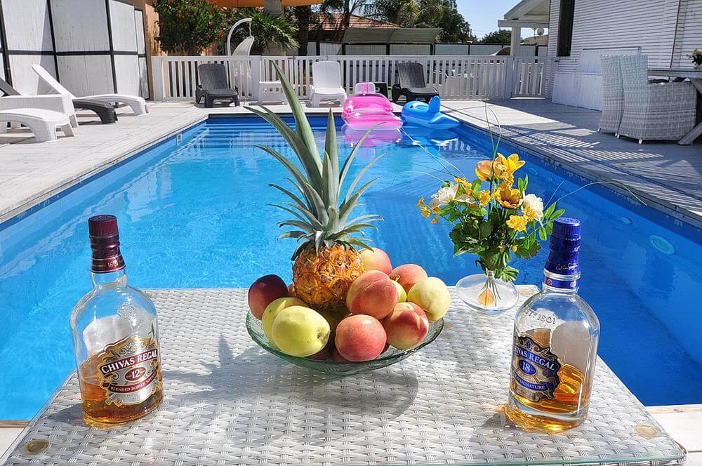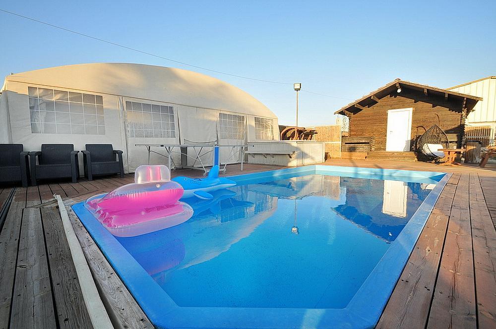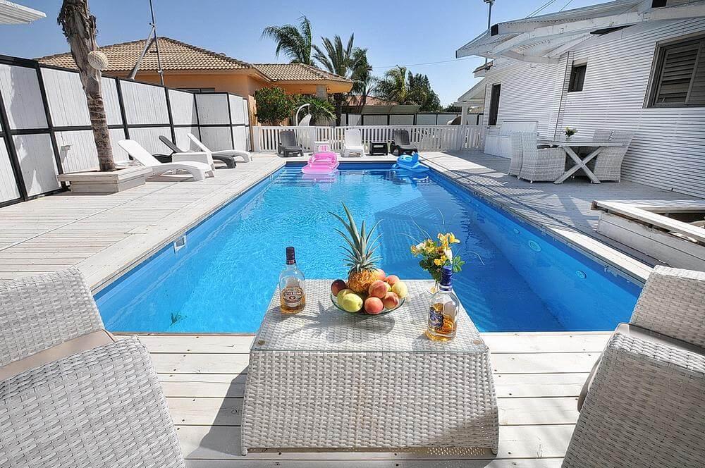 בריכת שחייה גדולה וצלולה + מיטות שיזוף