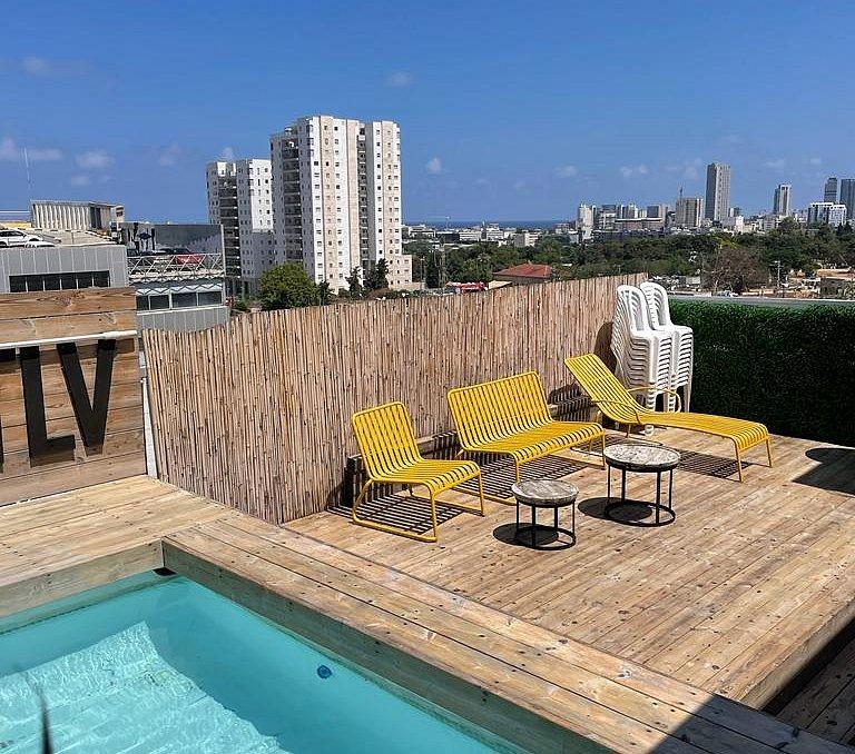 מתחם לופט מלא סטייל לאירועים והפקות עד 60 אורחים, נוף פנורמי לעיר תל אביב, בריכת שחיה על הגג, מגוון פינות רביצה, מיטות שיזוף ועוד.