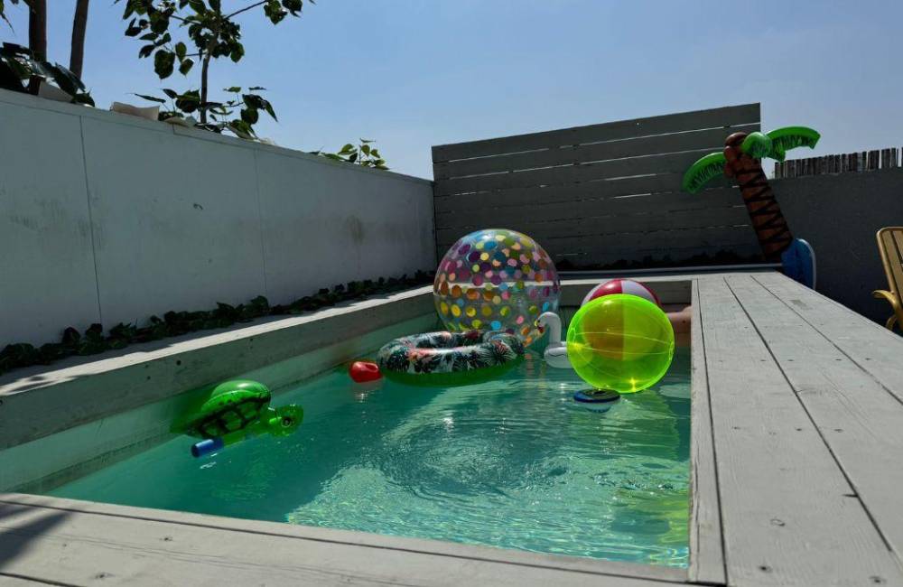 בריכת שחיה פרטית על בימת דק עץ פונה לכיוון נוף העיר