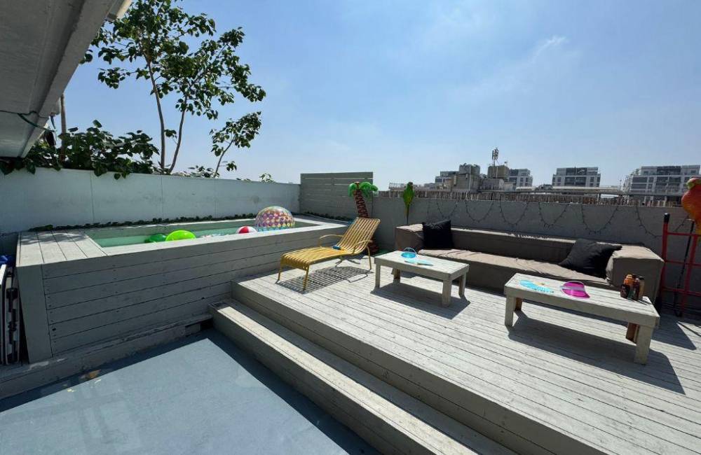 מרפסת בגודל 50 מ"ר ממוקמת על הגג מרוצפת דק, עם בריכת שחייה צלולה