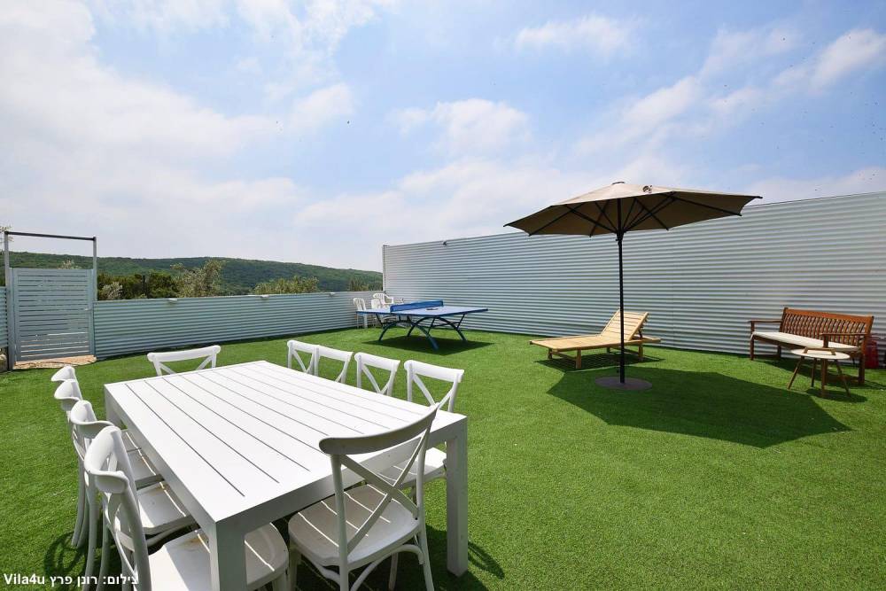 חצר עם מדשאות, שולחן פינג פונג וכדורגל, עמדת מנגל, פינת אוכל מקורה
