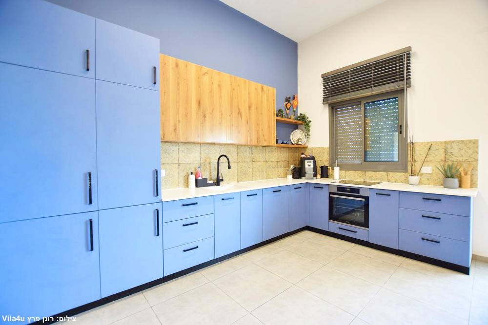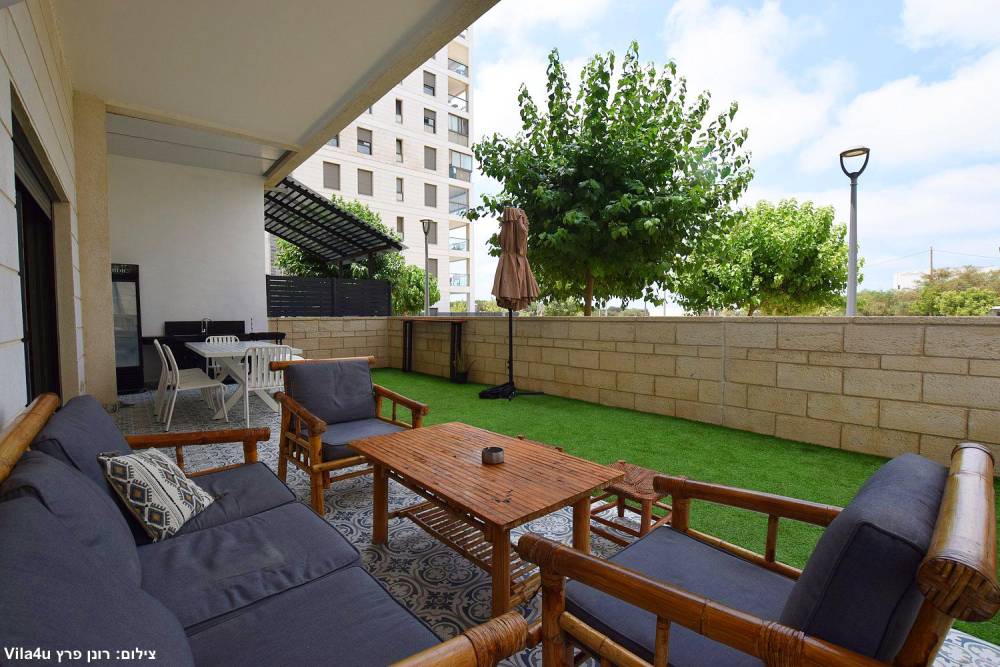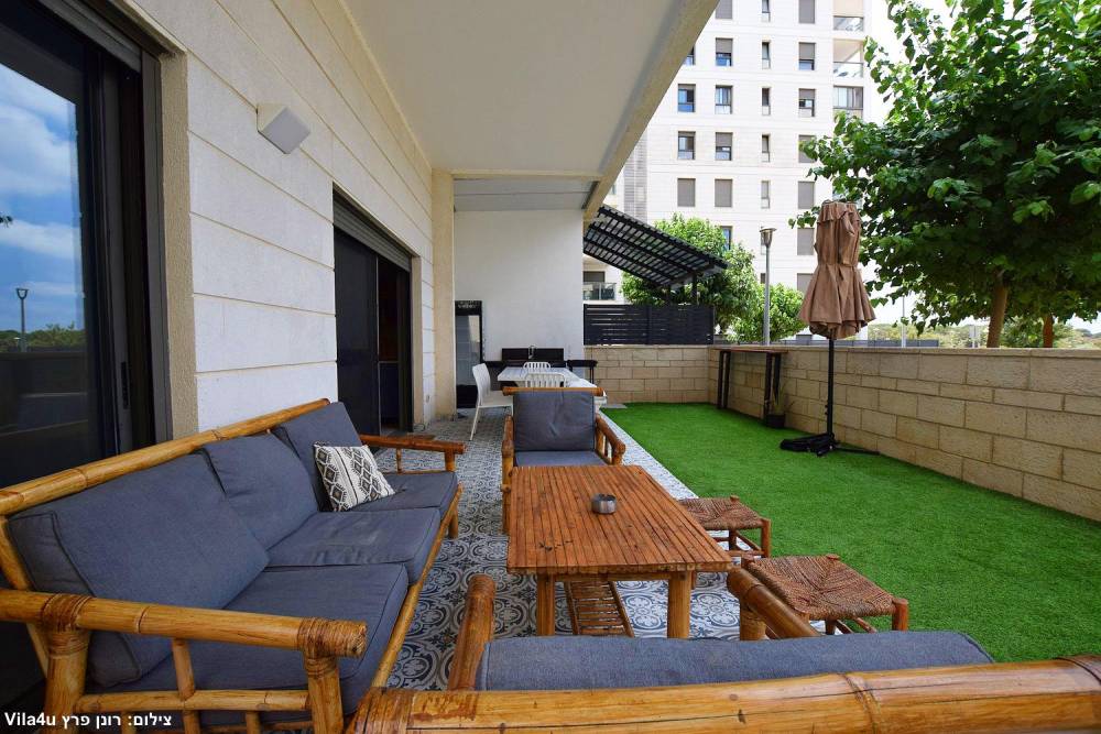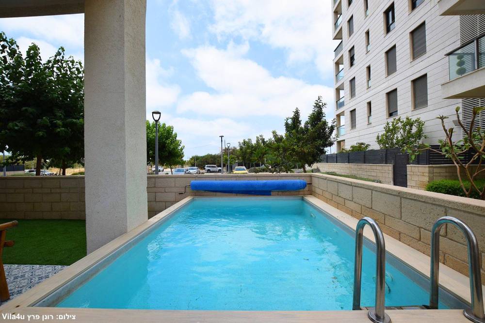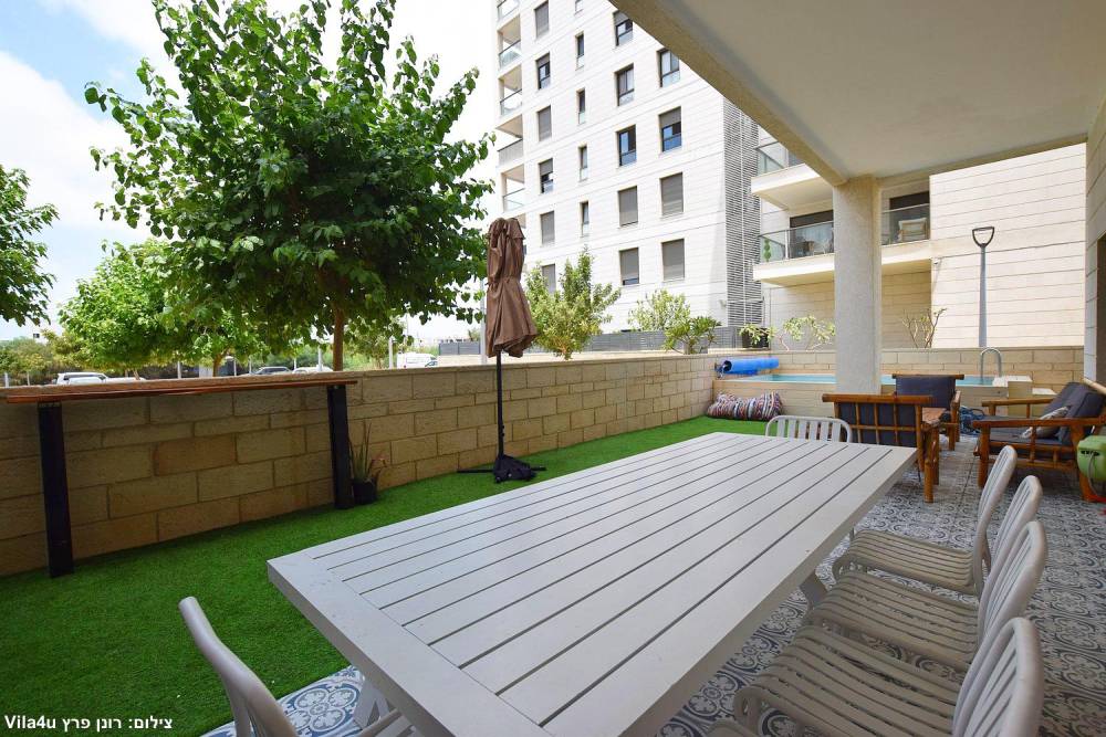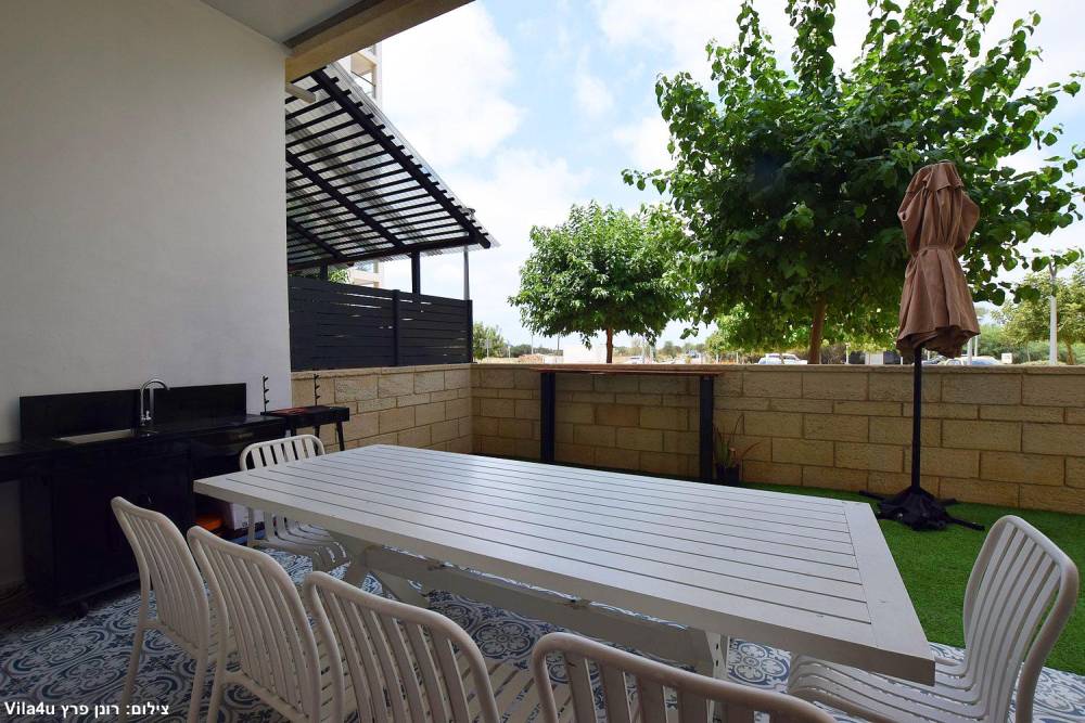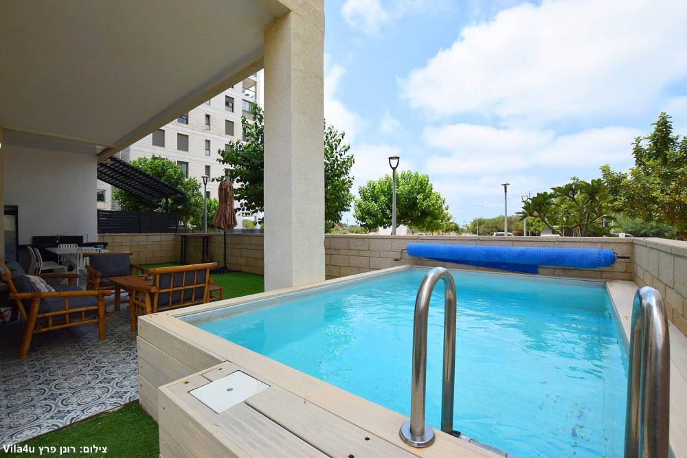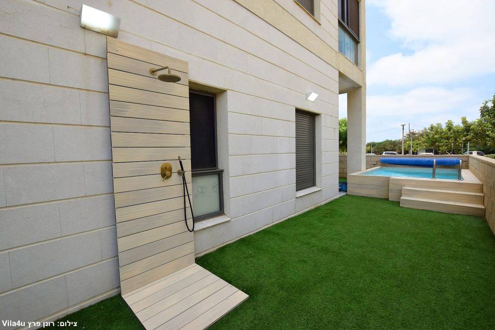 החצר הפרטית מציעה בריכה צלולה, מקלחון חוץ, מדשאות ירוקות, פינות ישיבה נוחות ופינת מנגל עם משטח עבודה, ברז וכיור.