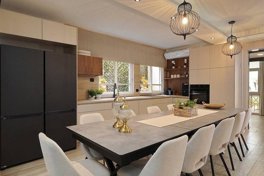סלון ענק עם מסך 75 אינץ' ופינת אוכל משפחתית